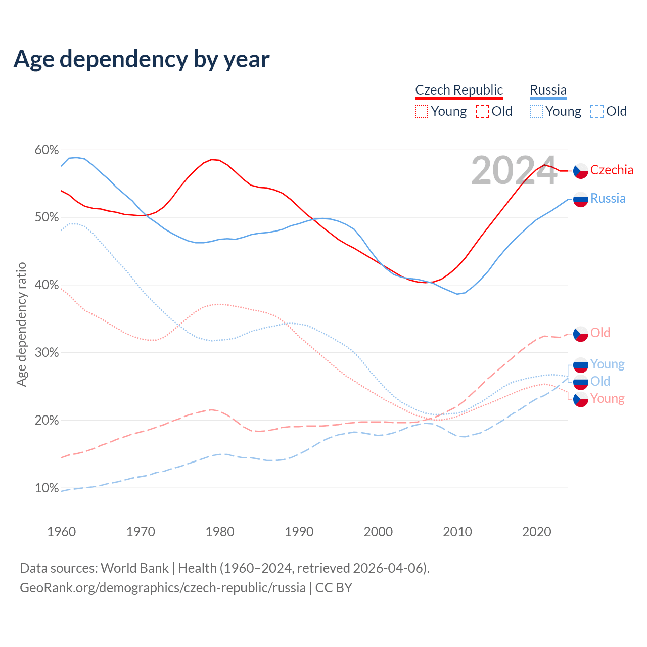 - The Czech Republic is ranked 21/196 by median age (oldest to youngest) vs 42/196 for Russia.