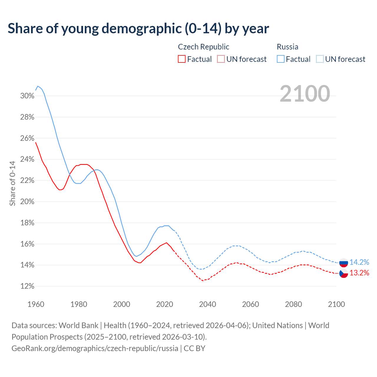 - As of 2026, the population of the Czech Republic is 10.6M vs 142M in Russia - 13.3 times difference.