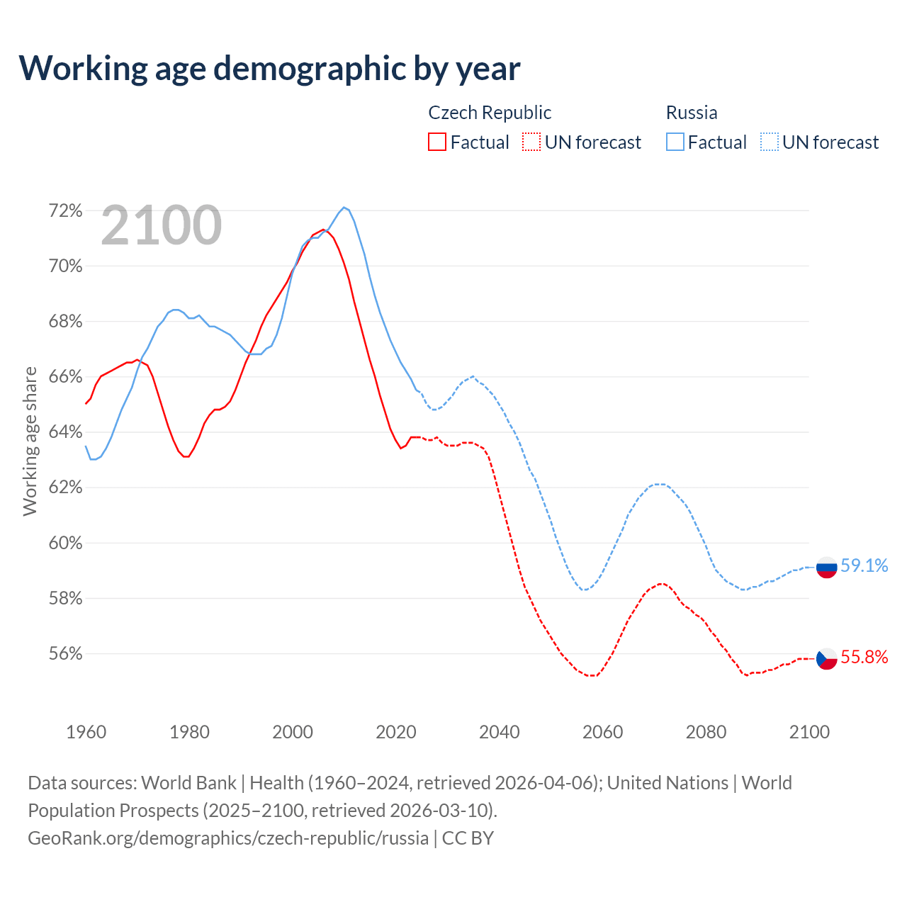 Median age Czech Republic vs Russia, 1960-2100