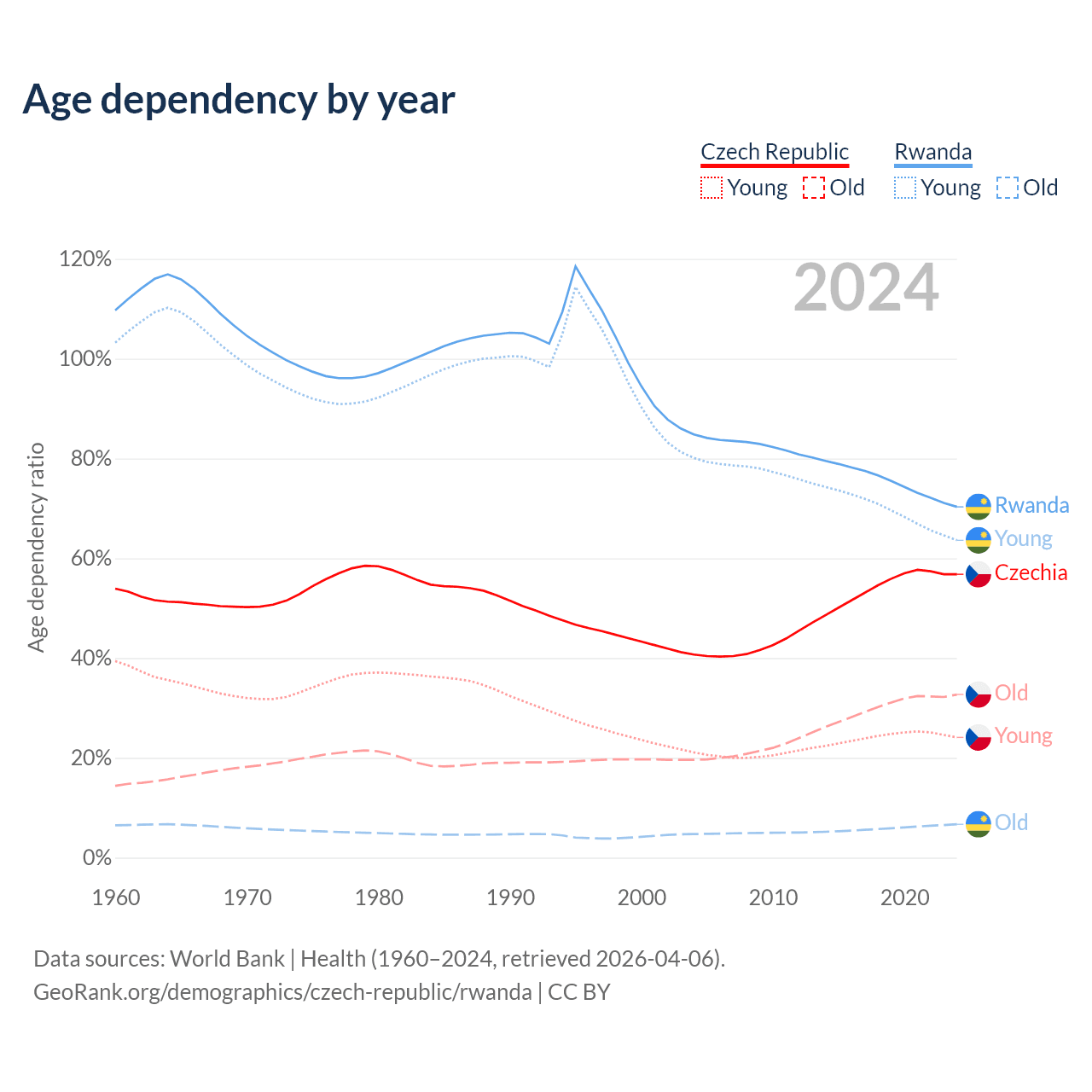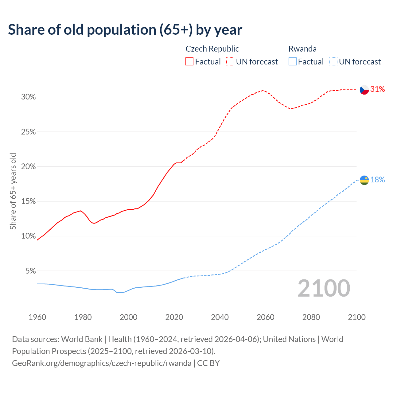 - The share of old-age demographic (65+) in the Czech Republic is 20.8% vs 3.93% in Rwanda.