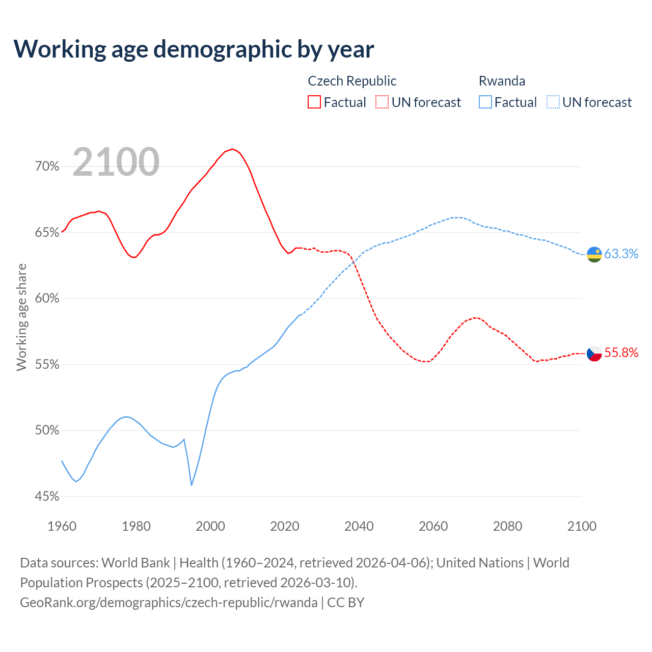 - The Czech Republic has 6.79M working age adults (aged 15-64) vs 8.79M in Rwanda.