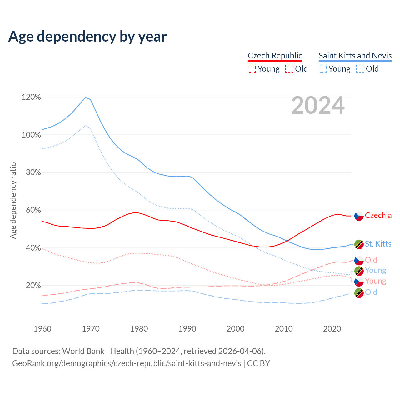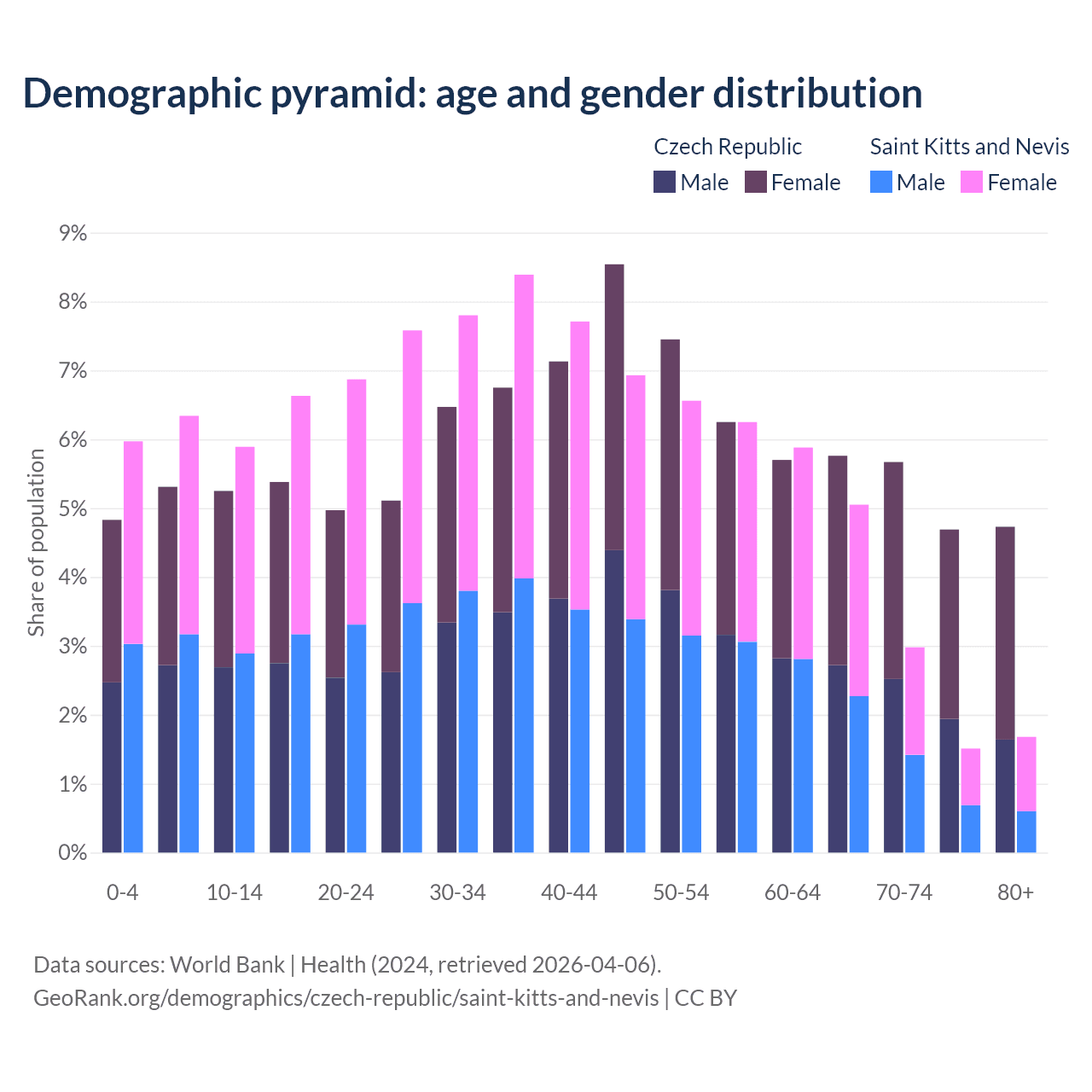 - The share of old-age demographic (65+) in the Czech Republic is 20.8% vs 11.2% in Saint Kitts and Nevis.