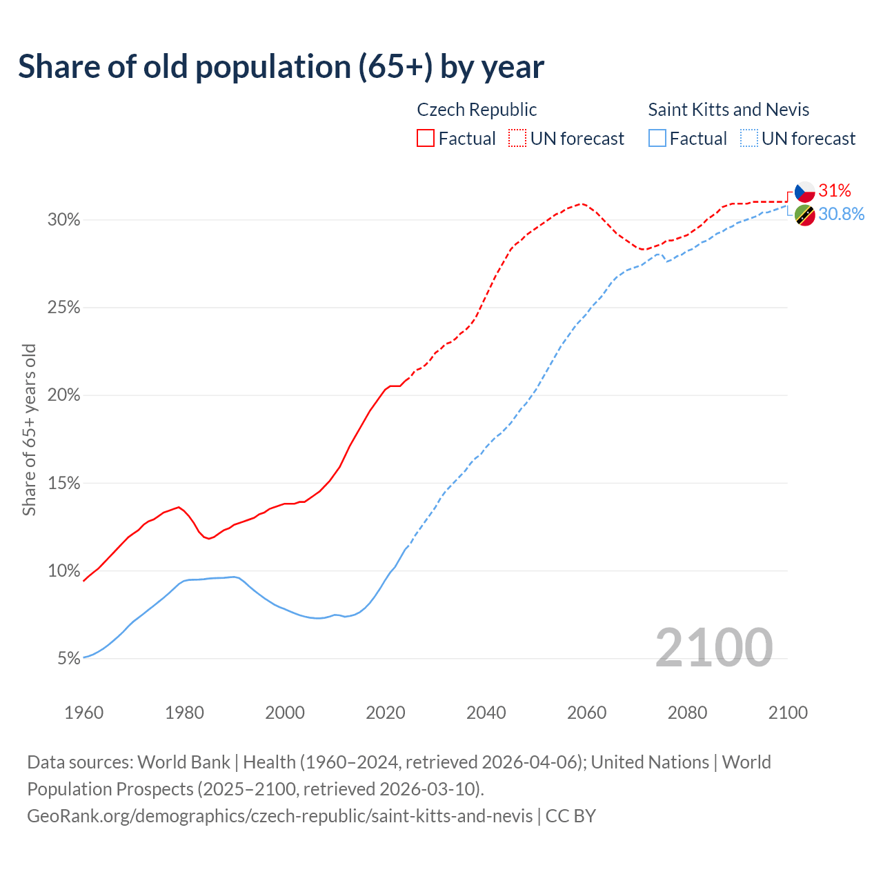 The share of older people aged 65 and over is 20.8% in the Czech Republic and 11.2% in Saint Kitts and Nevis. Life expectancy in the Czech Republic compared to Saint Kitts and Nevis .