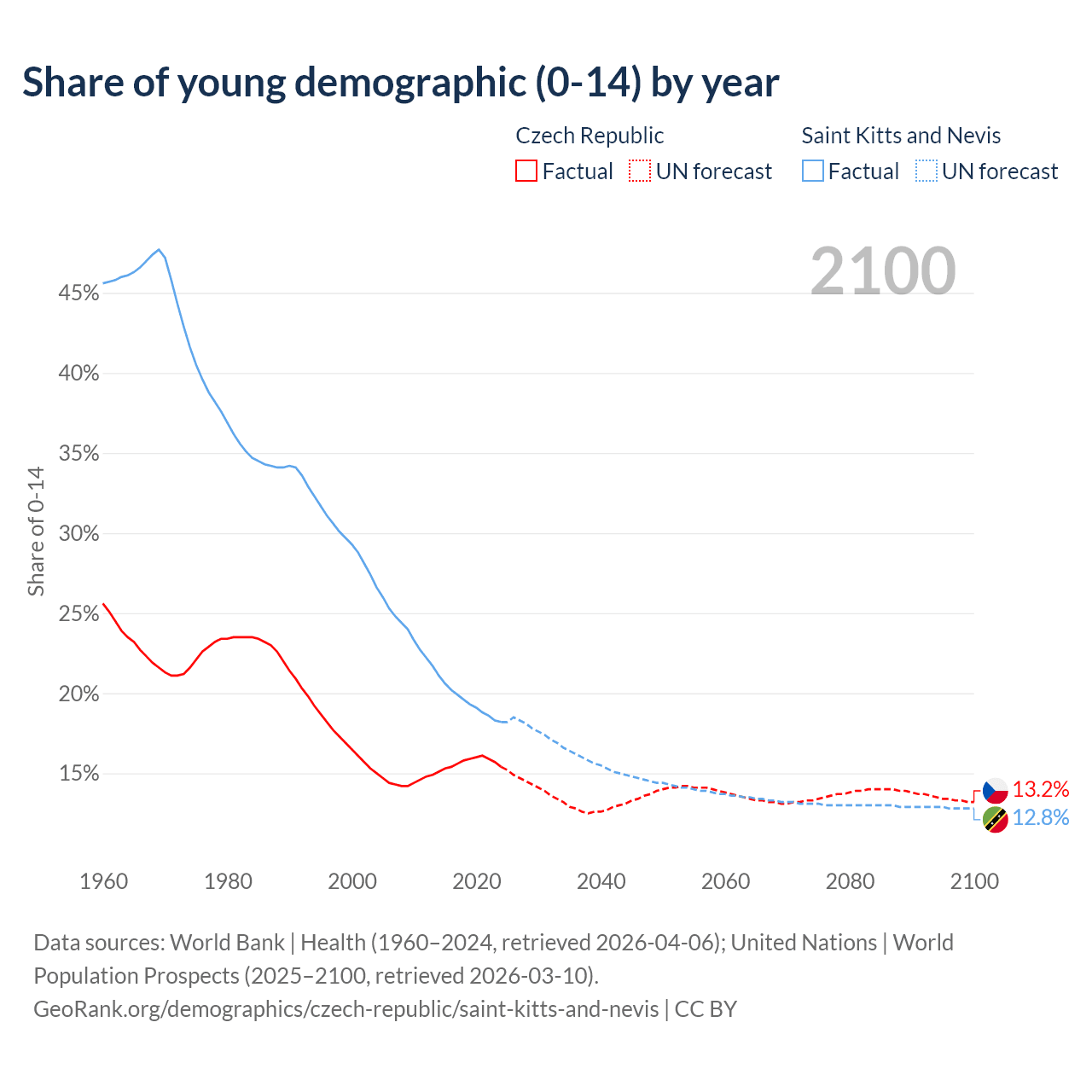 - The share of young demographic (0-15 years old) in the Czech Republic is 15.4% vs 18.2% in Saint Kitts and Nevis.