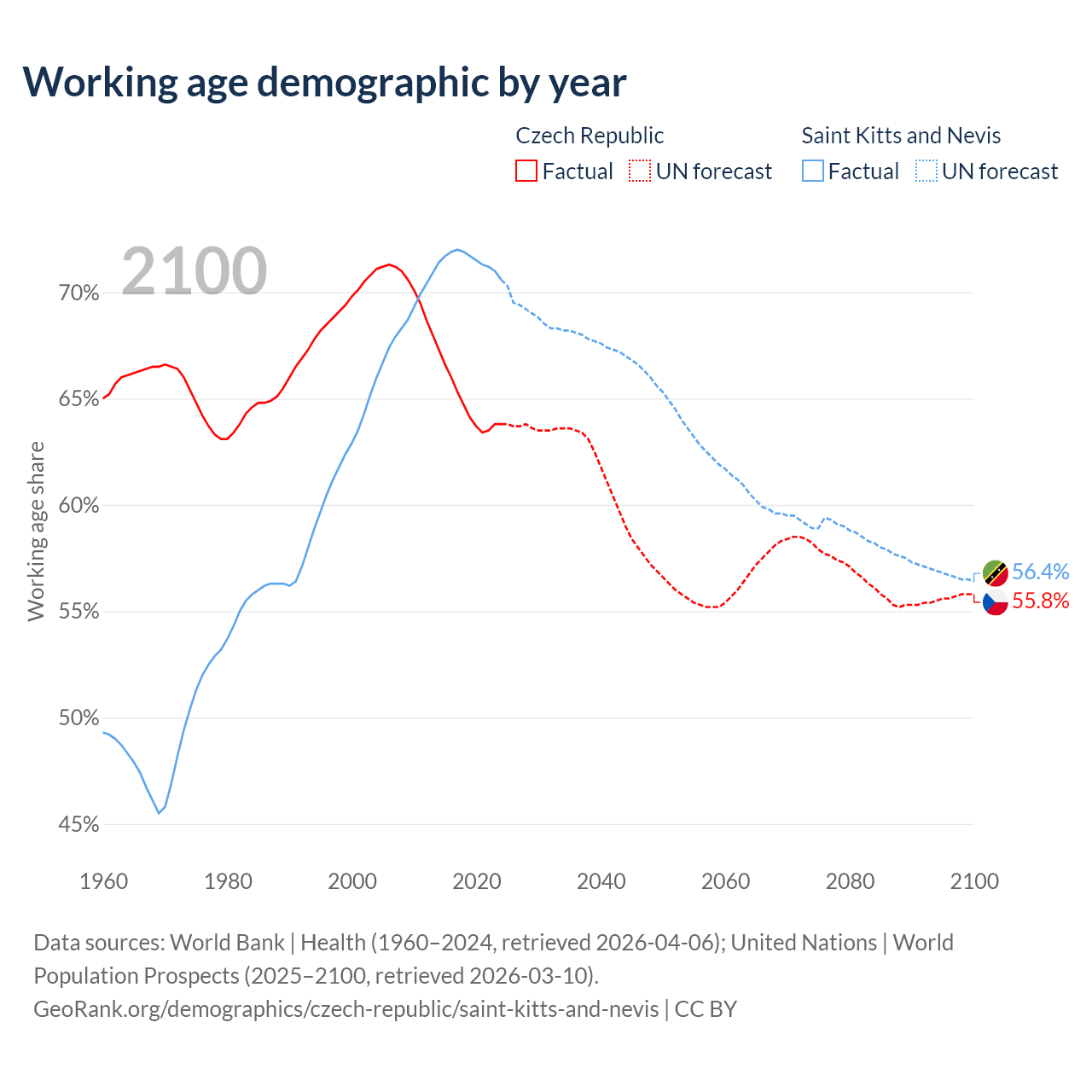- The Czech Republic has 6.79M working age adults (aged 15-64) vs 33.2K in Saint Kitts and Nevis.
