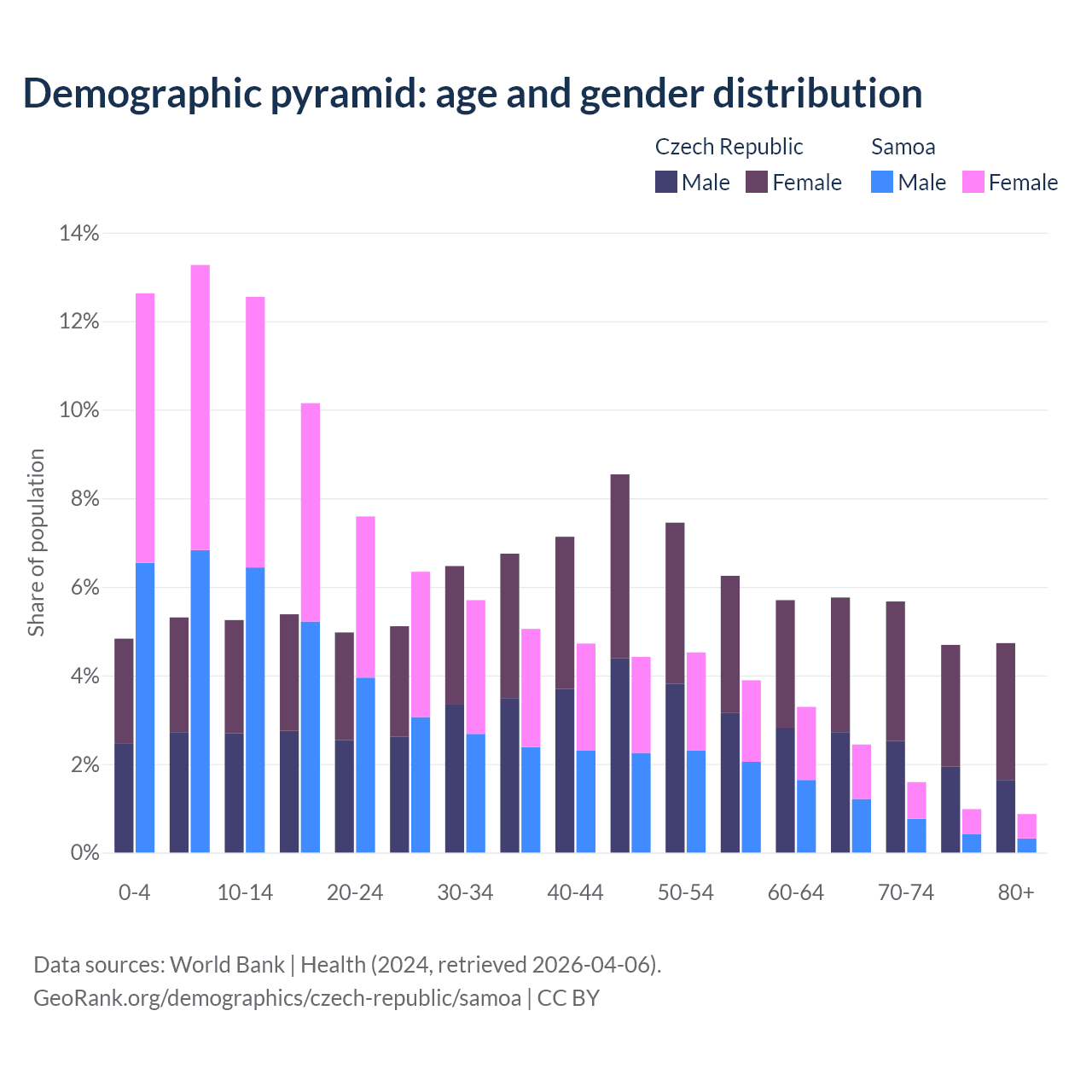 - As of 2026, the population of the Czech Republic is 10.6M vs 221K in Samoa - 48.2 times difference.