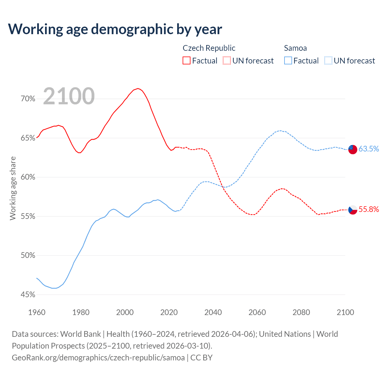 - The Czech Republic has 6.79M working age adults (aged 15-64) vs 123K in Samoa.