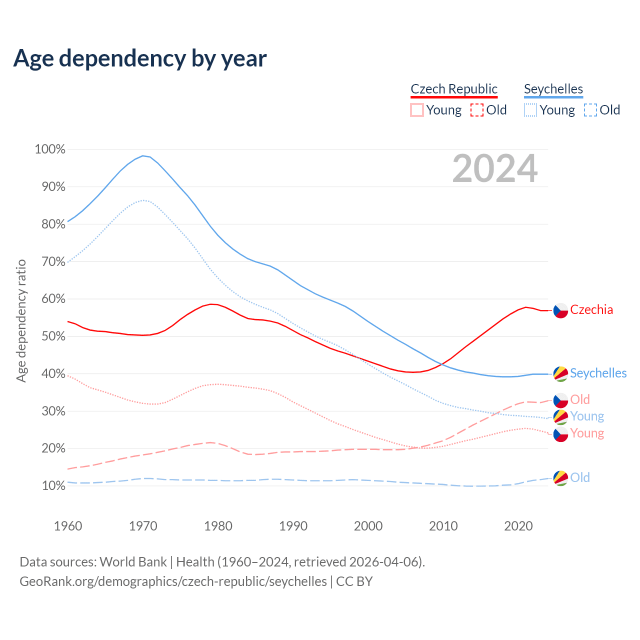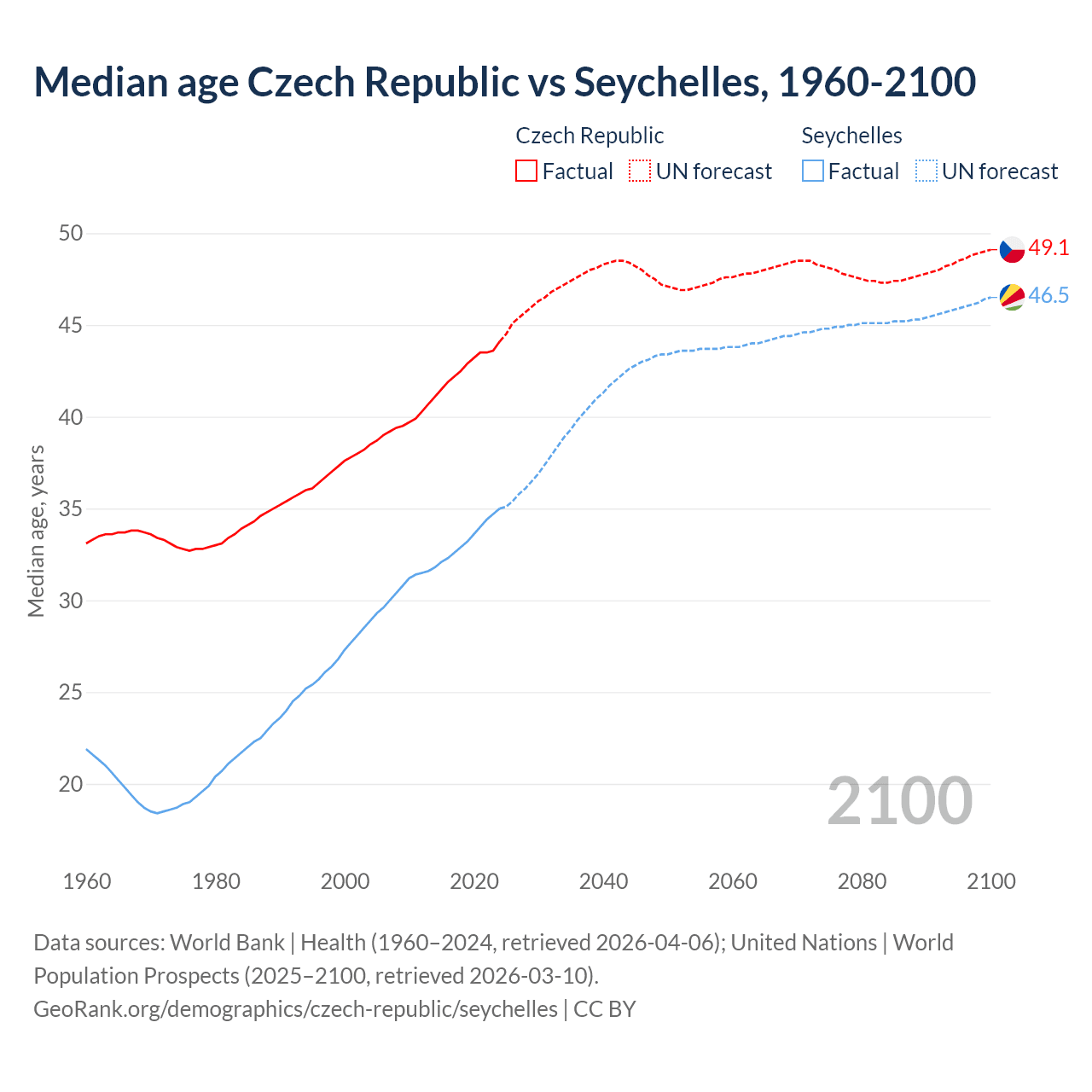 - The Czech Republic is ranked 21/196 by median age (oldest to youngest) vs 76/196 for the Seychelles.