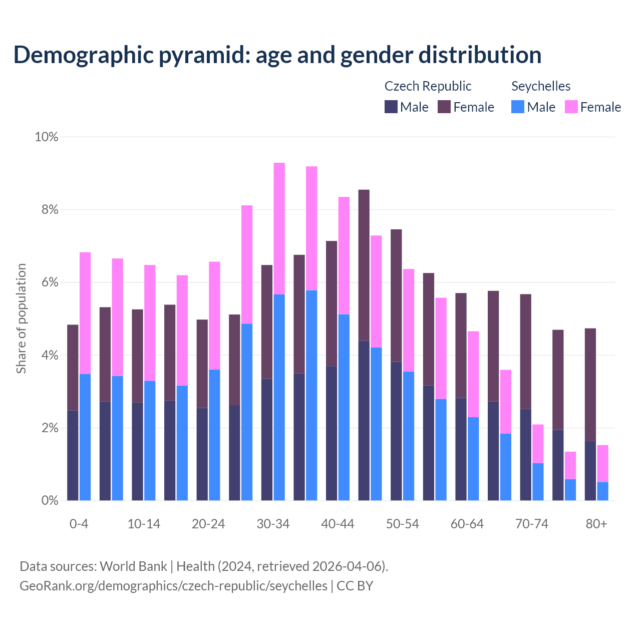 - As of 2026, the population of the Czech Republic is 10.6M vs 126K in the Seychelles - 84.3 times difference.