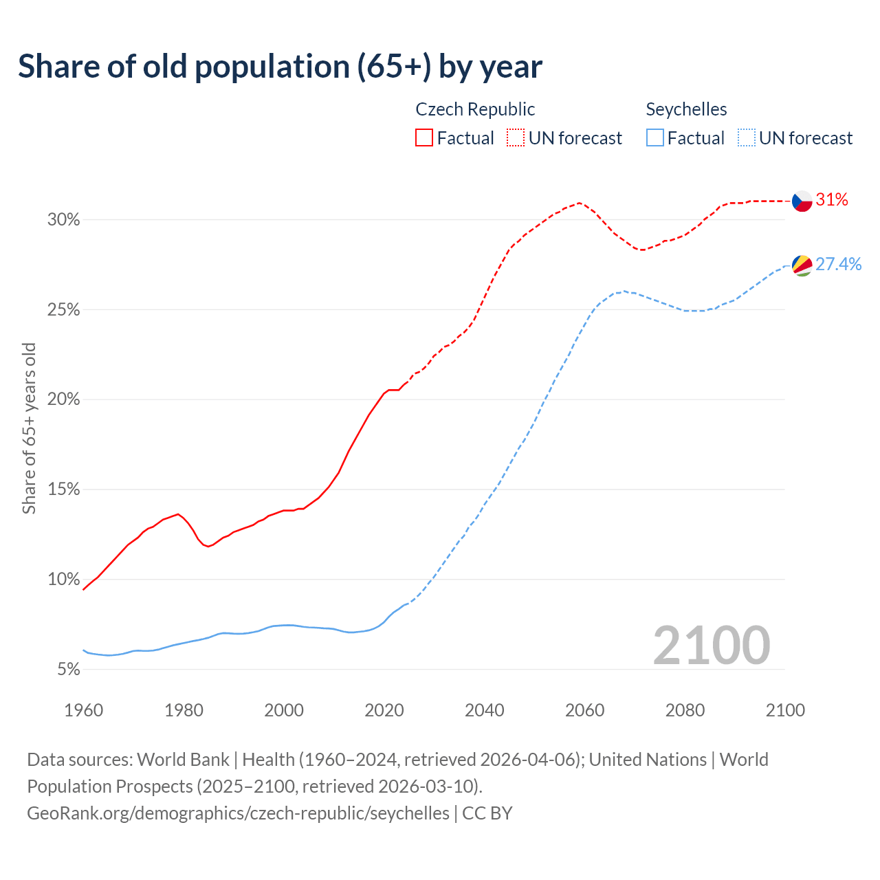 The share of older people aged 65 and over is 20.8% in the Czech Republic and 8.54% in the Seychelles. Life expectancy in the Czech Republic compared to the Seychelles .