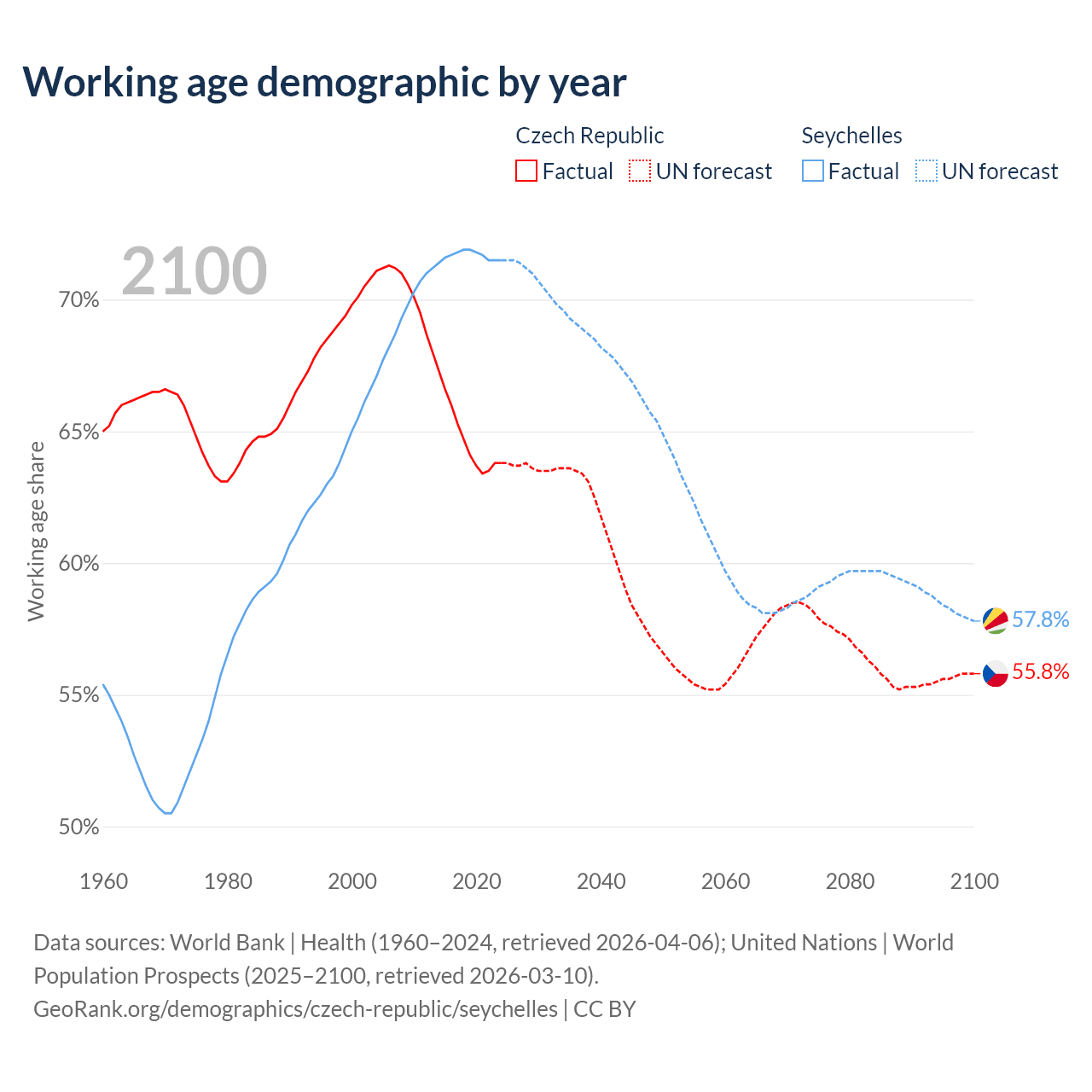 - The Czech Republic has 6.79M working age adults (aged 15-64) vs 90.3K in the Seychelles.