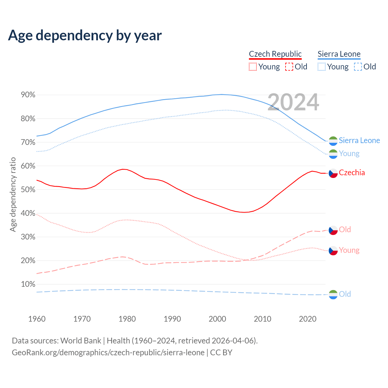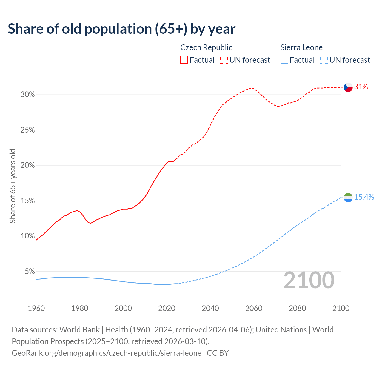 - The share of old-age demographic (65+) in the Czech Republic is 20.8% vs 3.24% in Sierra Leone.