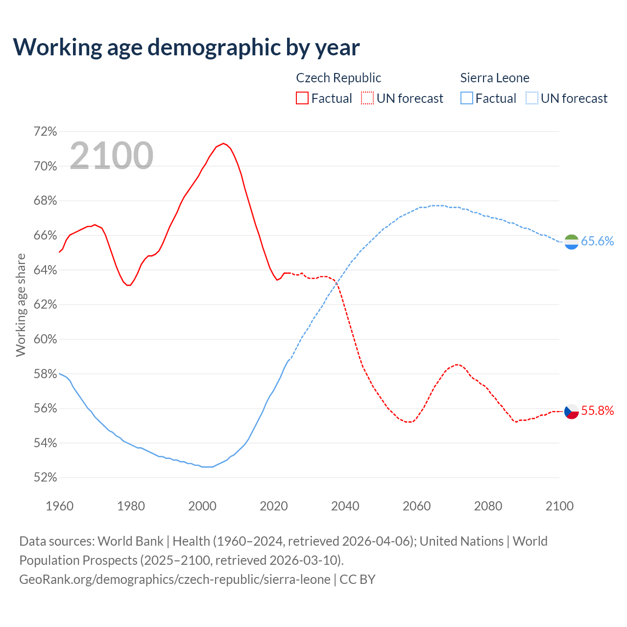 - The Czech Republic has 6.79M working age adults (aged 15-64) vs 5.31M in Sierra Leone.