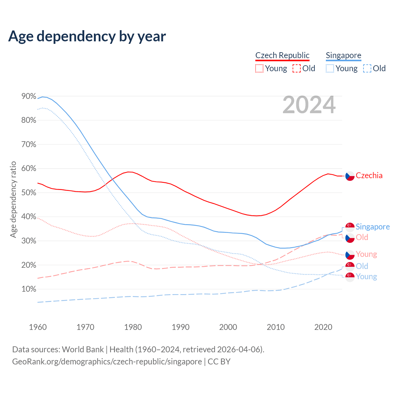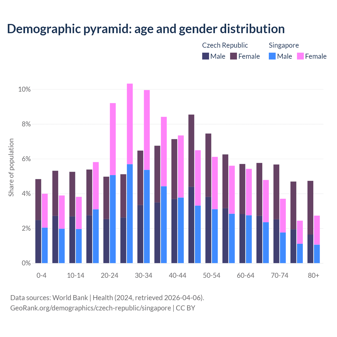 - The Czech Republic is ranked 21/196 by median age (oldest to youngest) vs 68/196 for Singapore.