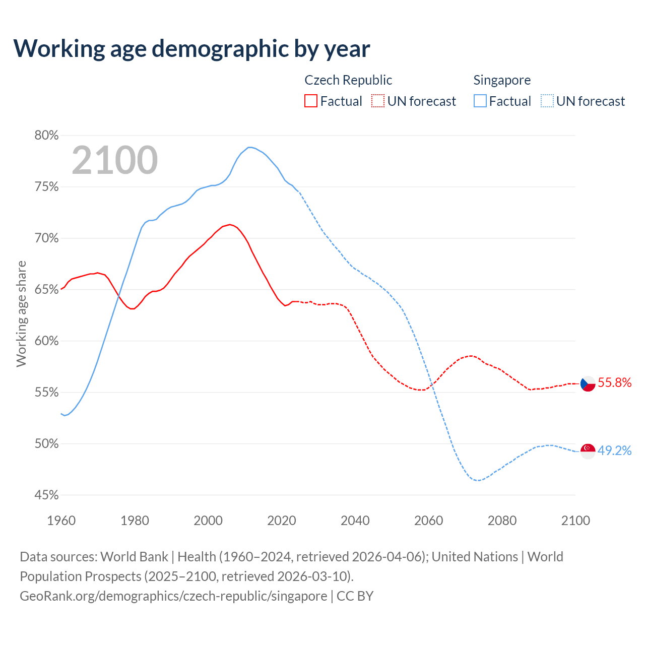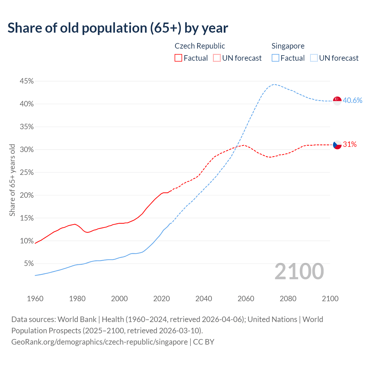 The share of older people aged 65 and over is 20.8% in the Czech Republic and 13.7% in Singapore. Life expectancy in the Czech Republic compared to Singapore .