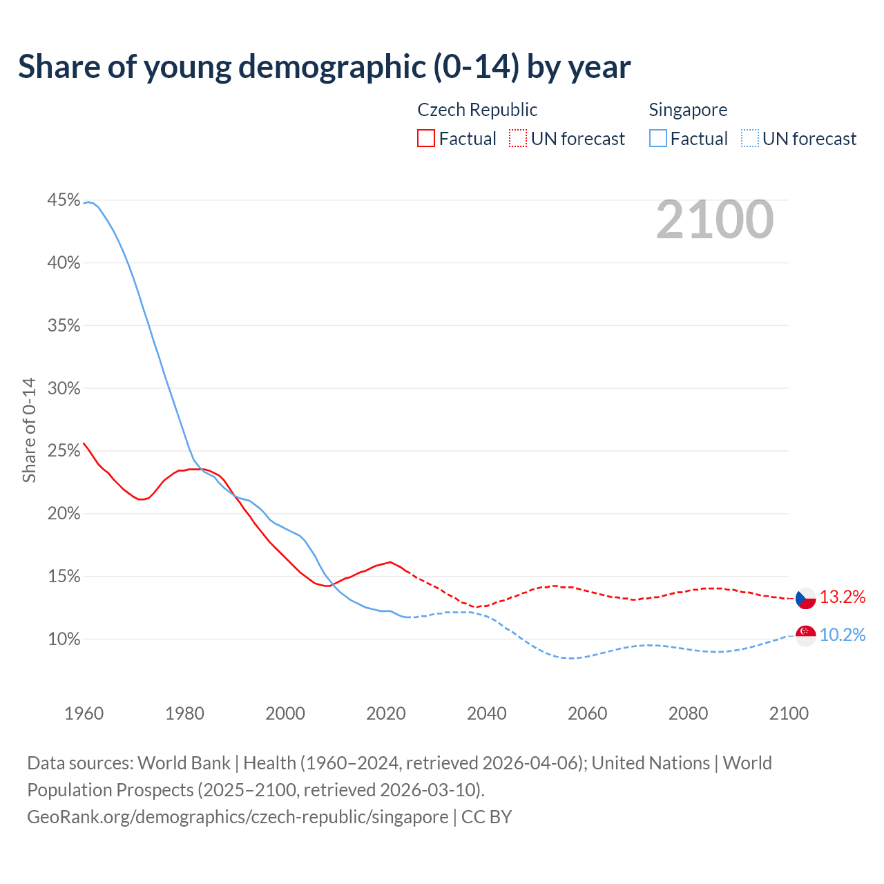 - The share of young demographic (0-15 years old) in the Czech Republic is 15.4% vs 11.7% in Singapore.