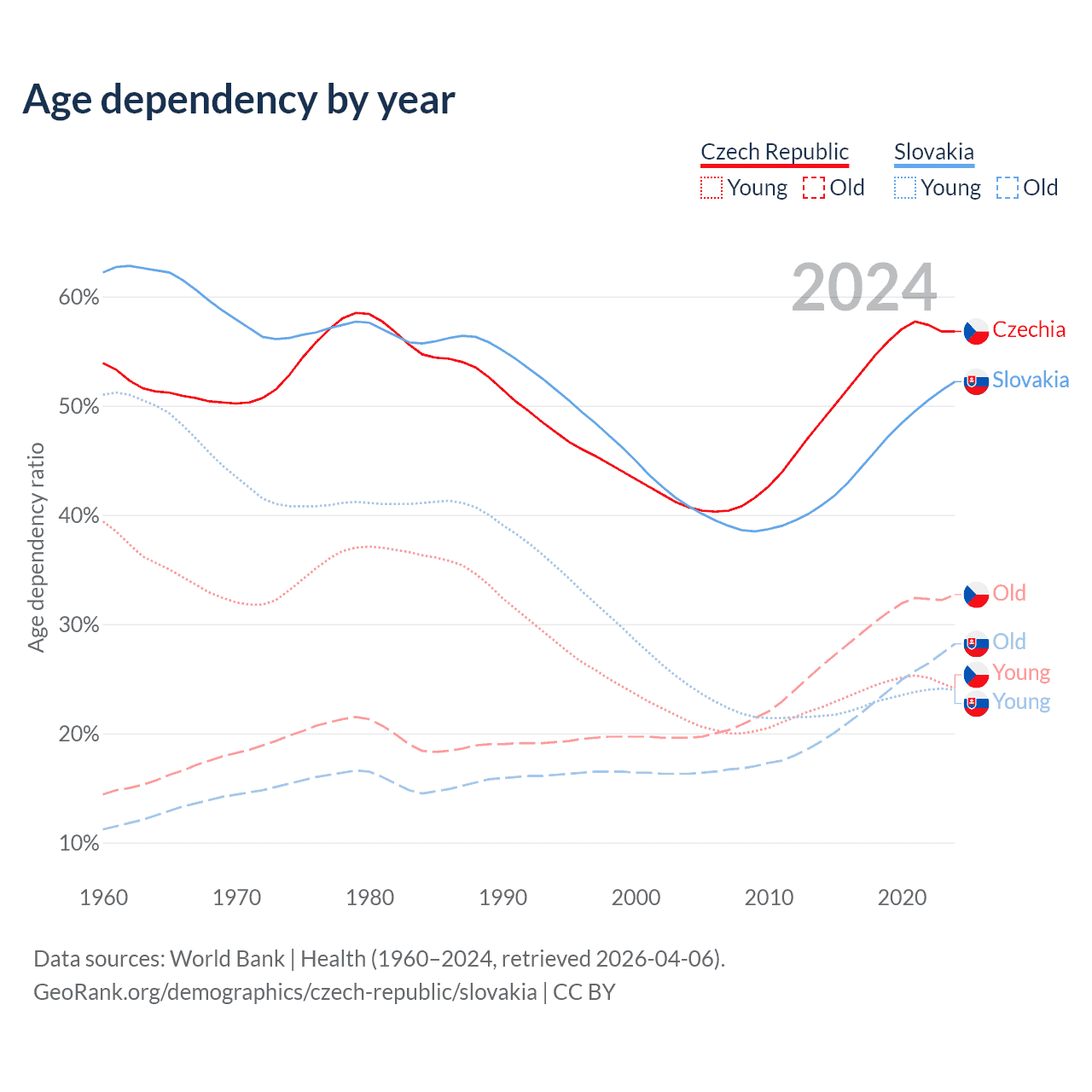 Data sources: World Bank | Health (1960–2024, retrieved 2026-04-06); U.S. Census Bureau (1960–2024, retrieved 2026-02-08).