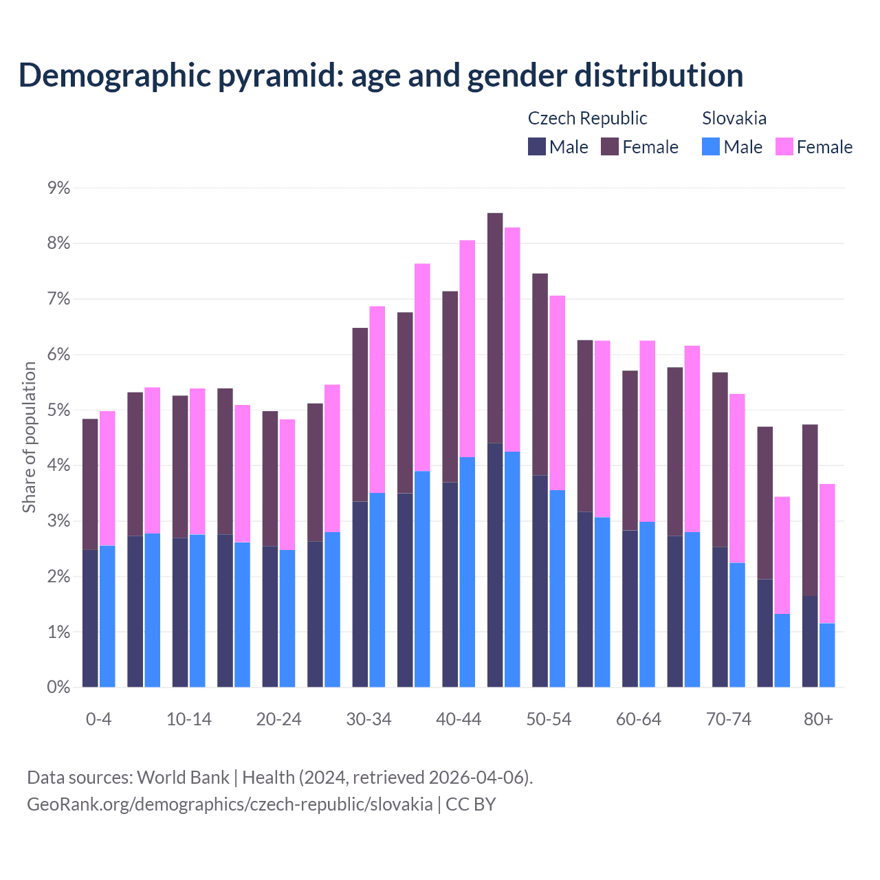 - The Czech Republic is ranked 21/196 by median age (oldest to youngest) vs 31/196 for Slovakia.