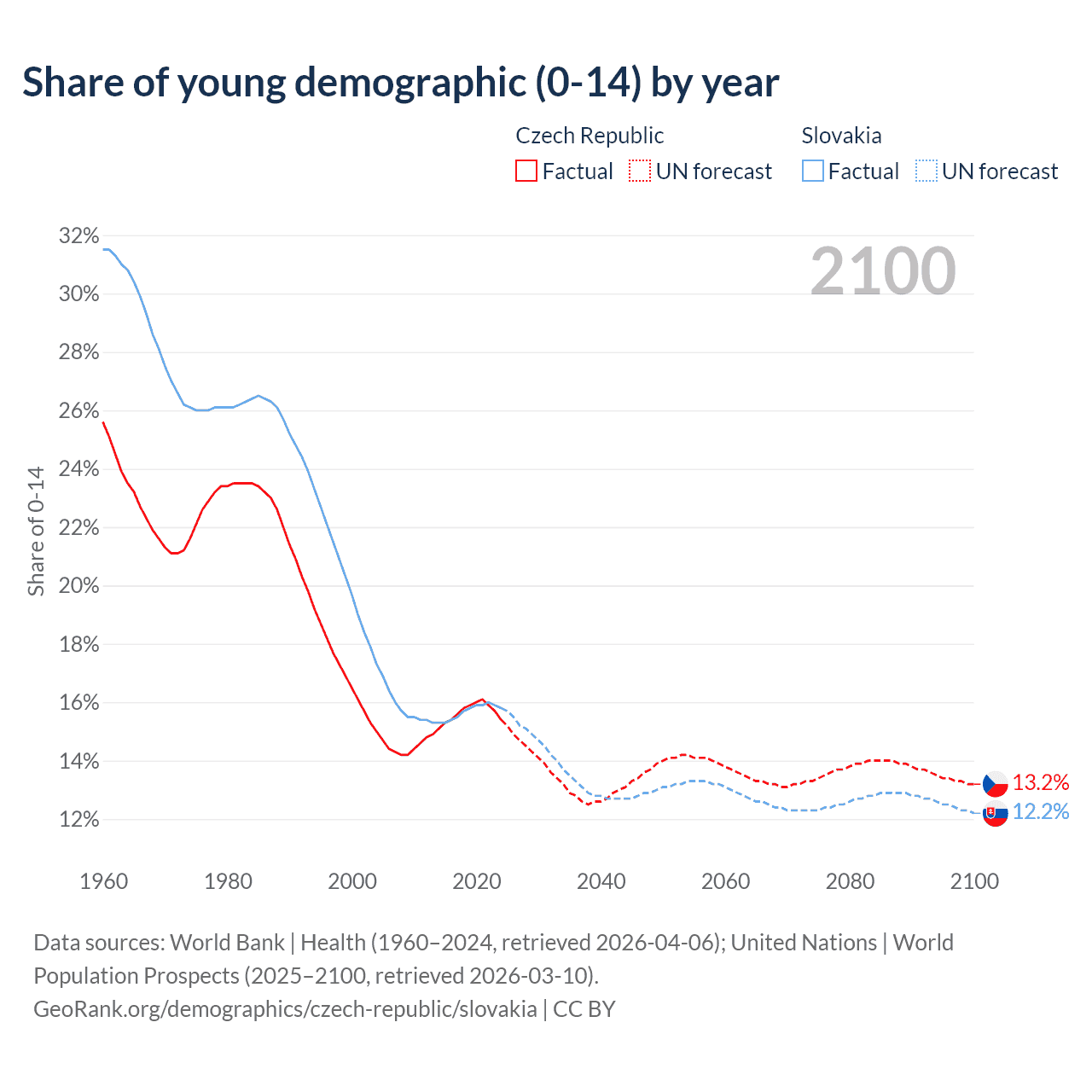 Median age Czech Republic vs Slovakia, 1960-2100
