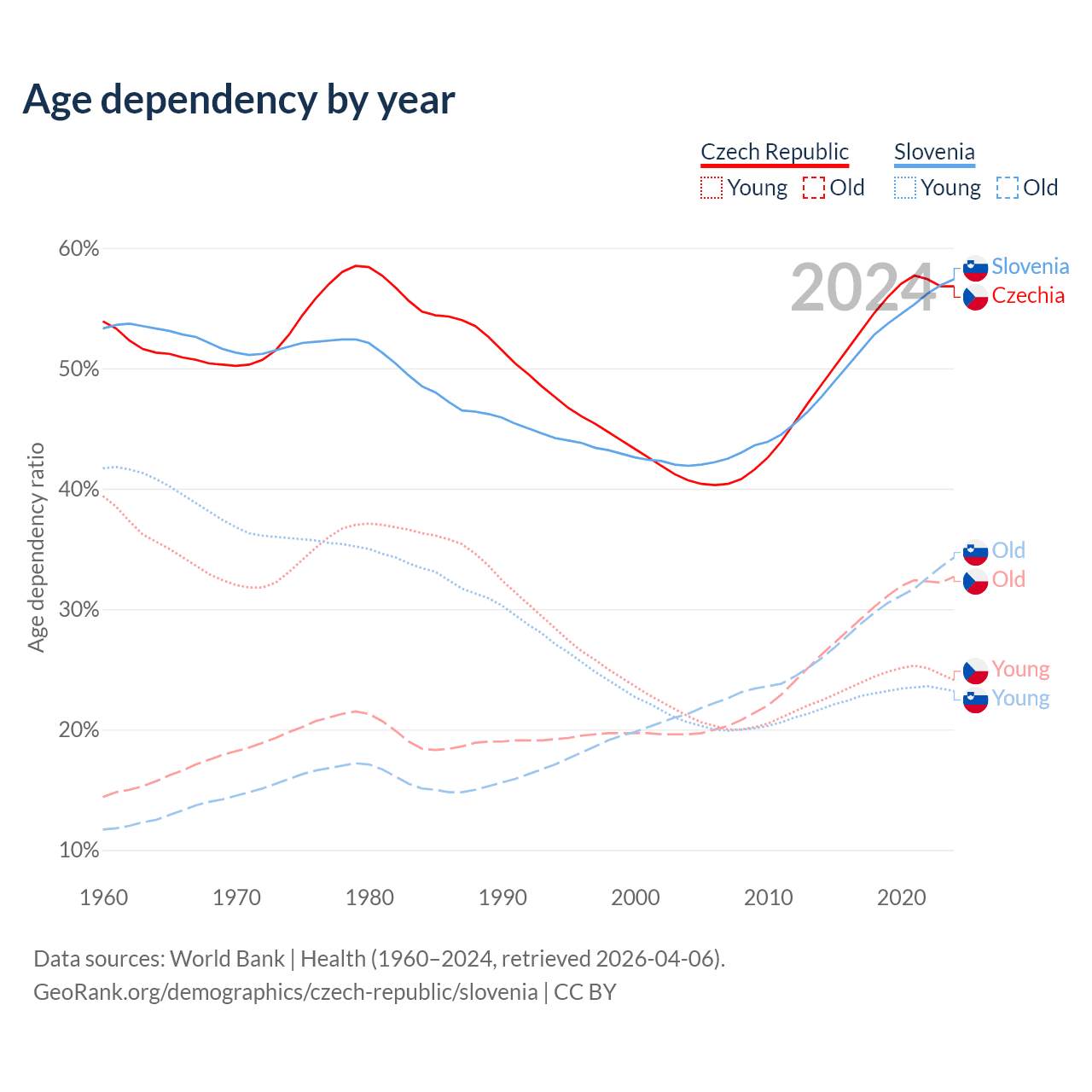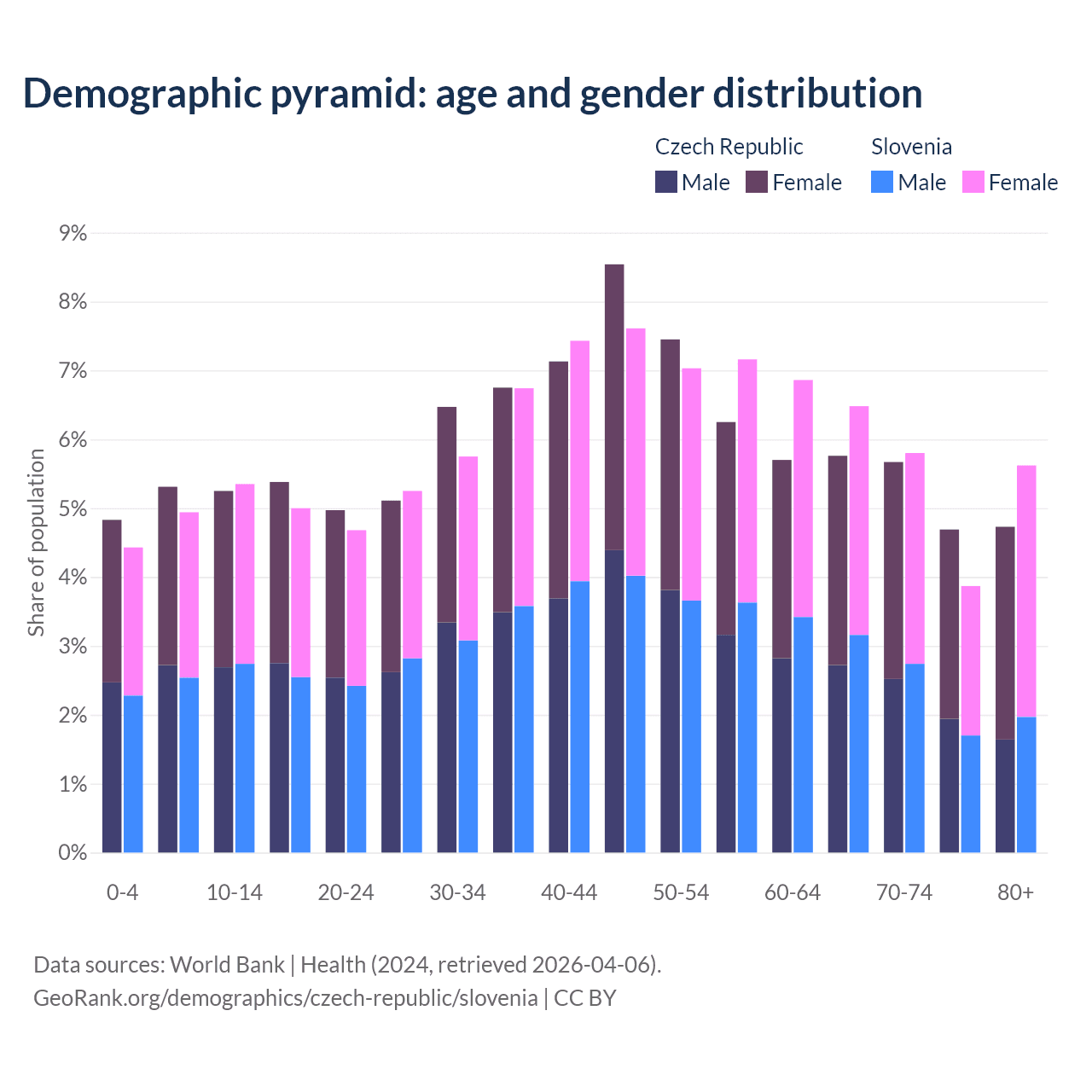- The Czech Republic is ranked 21/196 by median age (oldest to youngest) vs 14/196 for Slovenia.