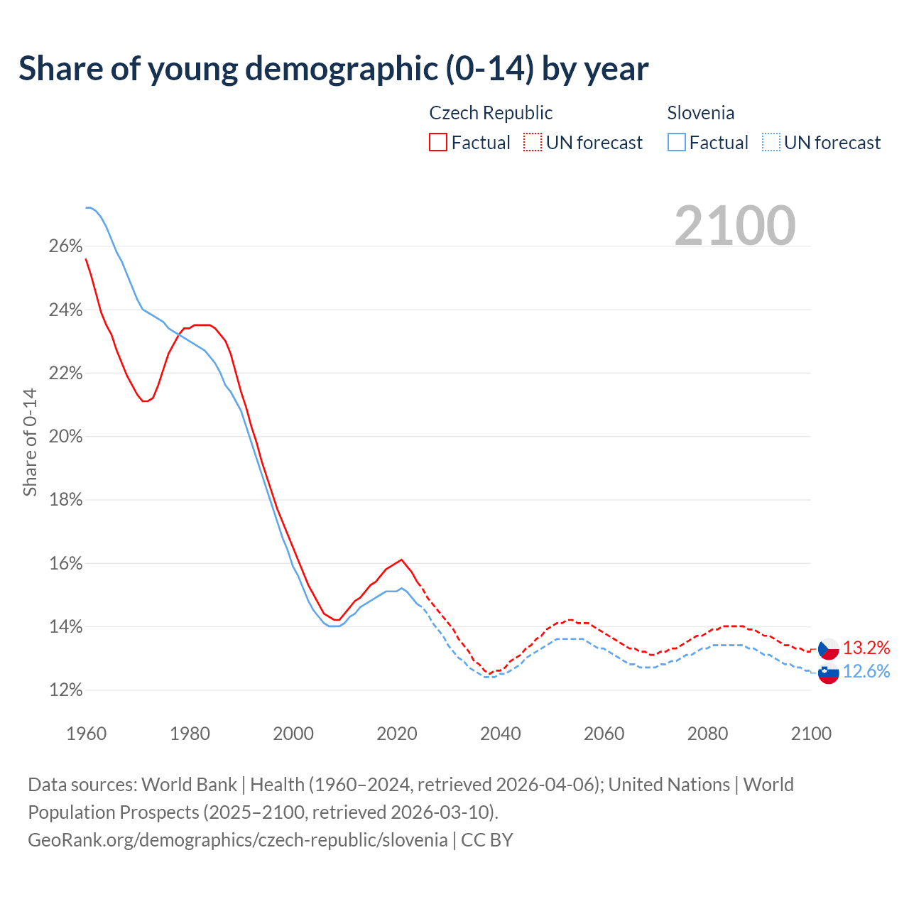 - The share of young demographic (0-15 years old) in the Czech Republic is 15.4% vs 14.7% in Slovenia.