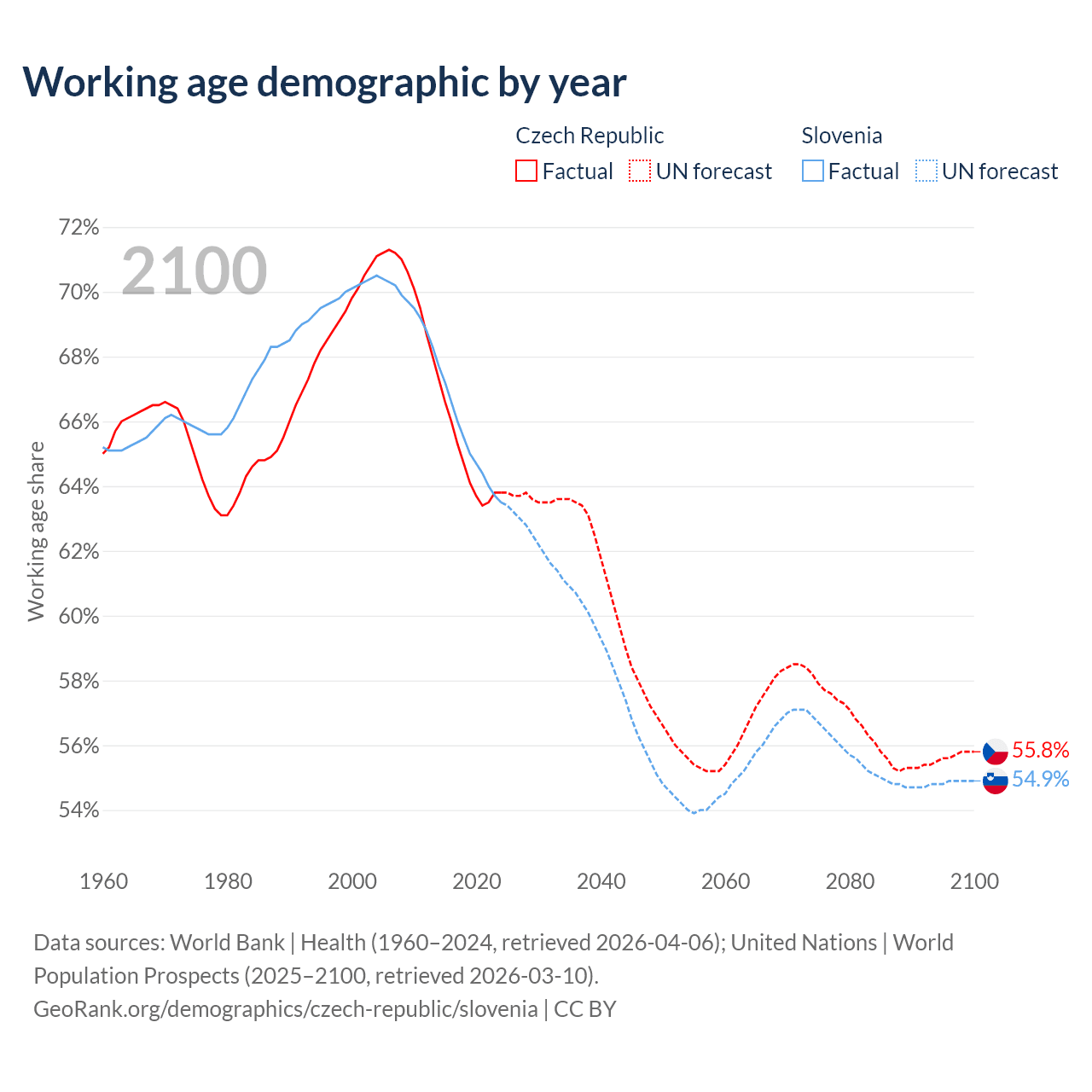 Median age Czech Republic vs Slovenia, 1960-2100