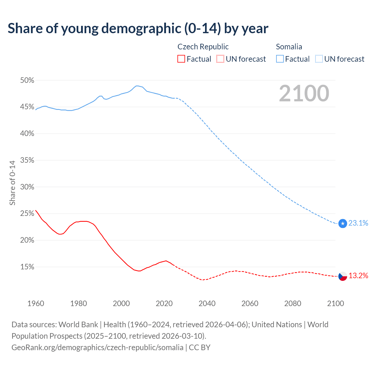 - The share of young demographic (0-15 years old) in the Czech Republic is 15.4% vs 46.6% in Somalia.