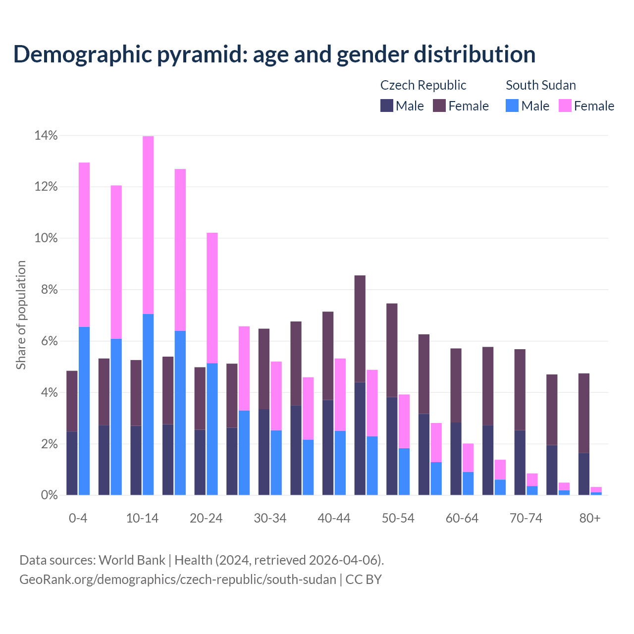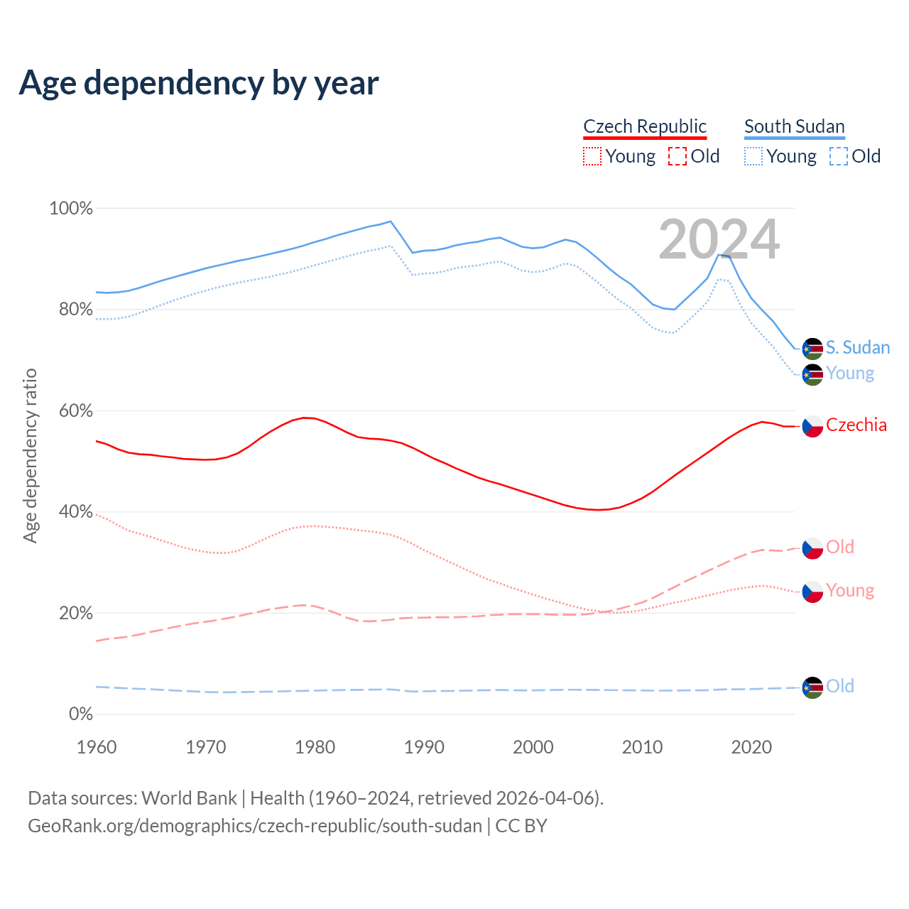 - The Czech Republic is ranked 21/196 by median age (oldest to youngest) vs 173/196 for South Sudan.