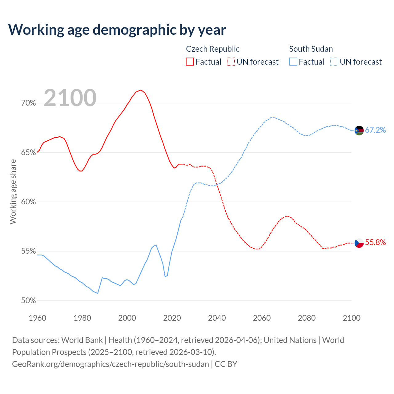- The Czech Republic has 6.79M working age adults (aged 15-64) vs 7.27M in South Sudan.