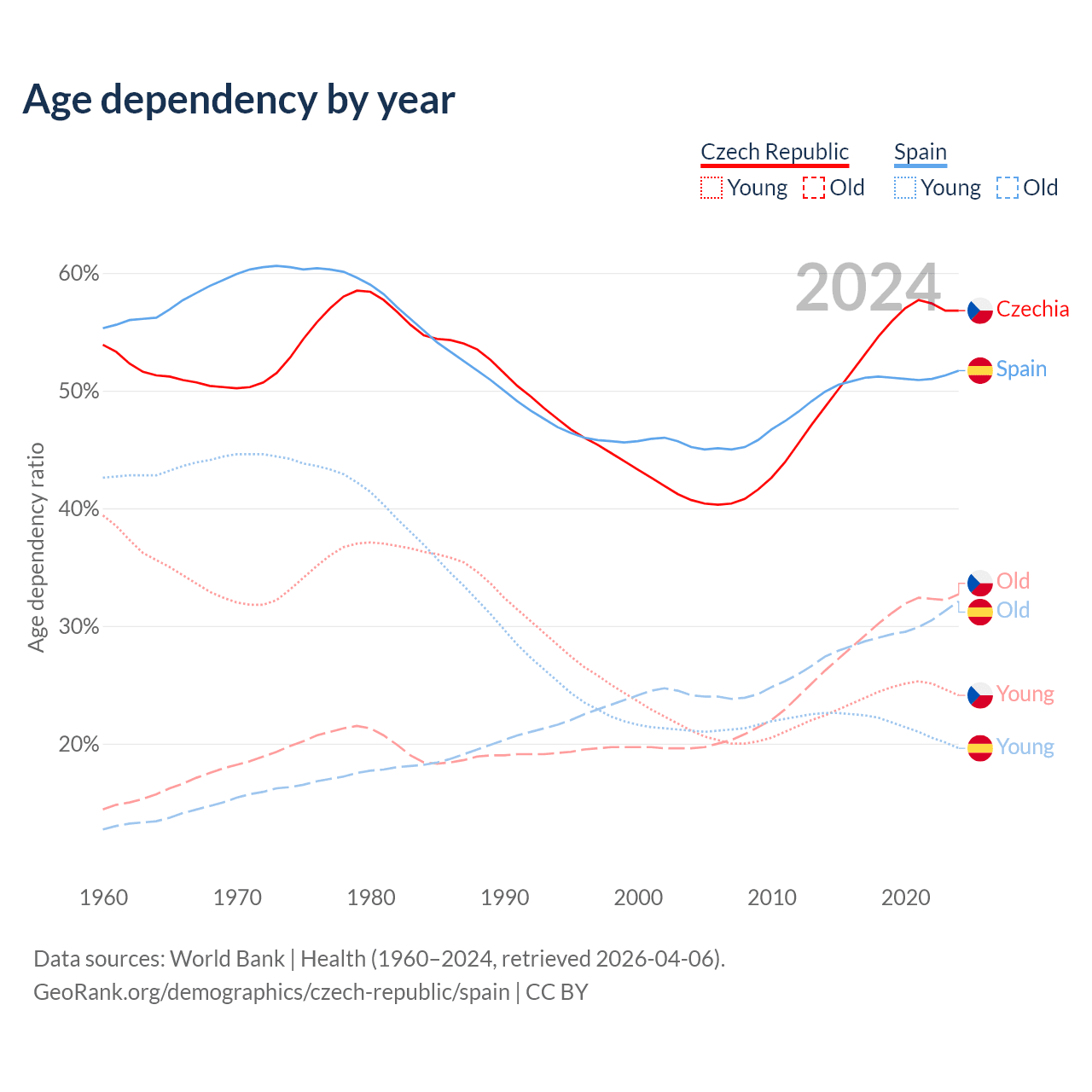- The Czech Republic is ranked 21/196 by median age (oldest to youngest) vs 7/196 for Spain.