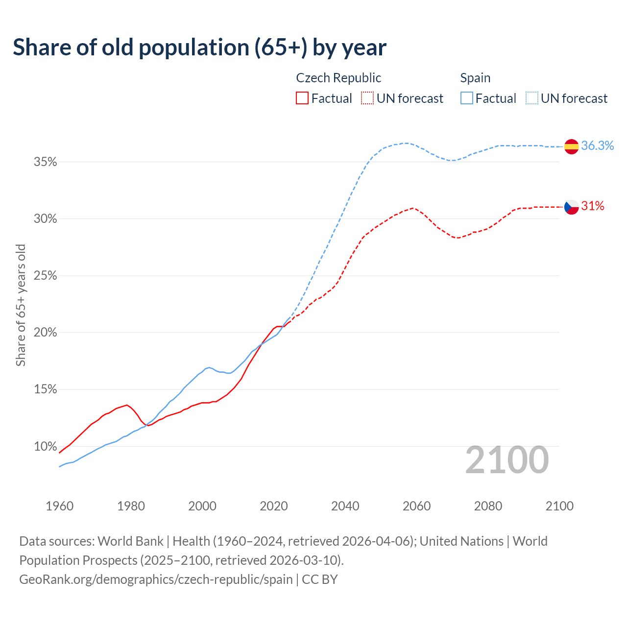The share of older people aged 65 and over is 20.8% in the Czech Republic and 21.1% in Spain. Life expectancy in the Czech Republic compared to Spain .