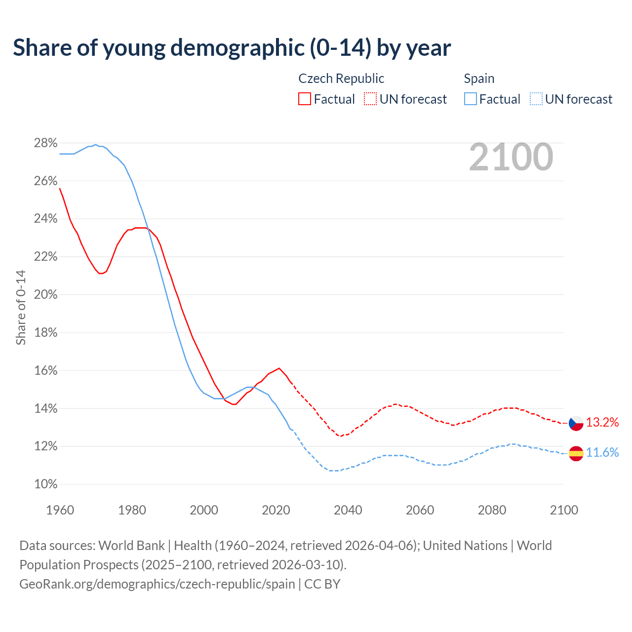 - The share of young demographic (0-15 years old) in the Czech Republic is 15.4% vs 12.9% in Spain.