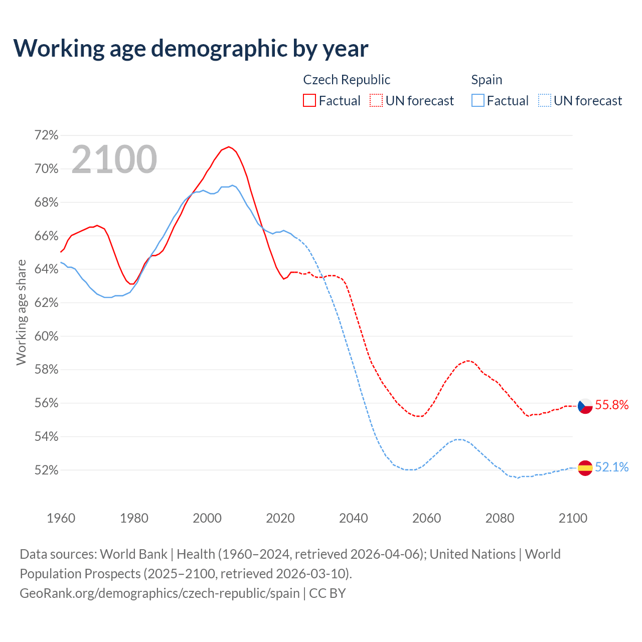 Median age Czech Republic vs Spain, 1960-2100