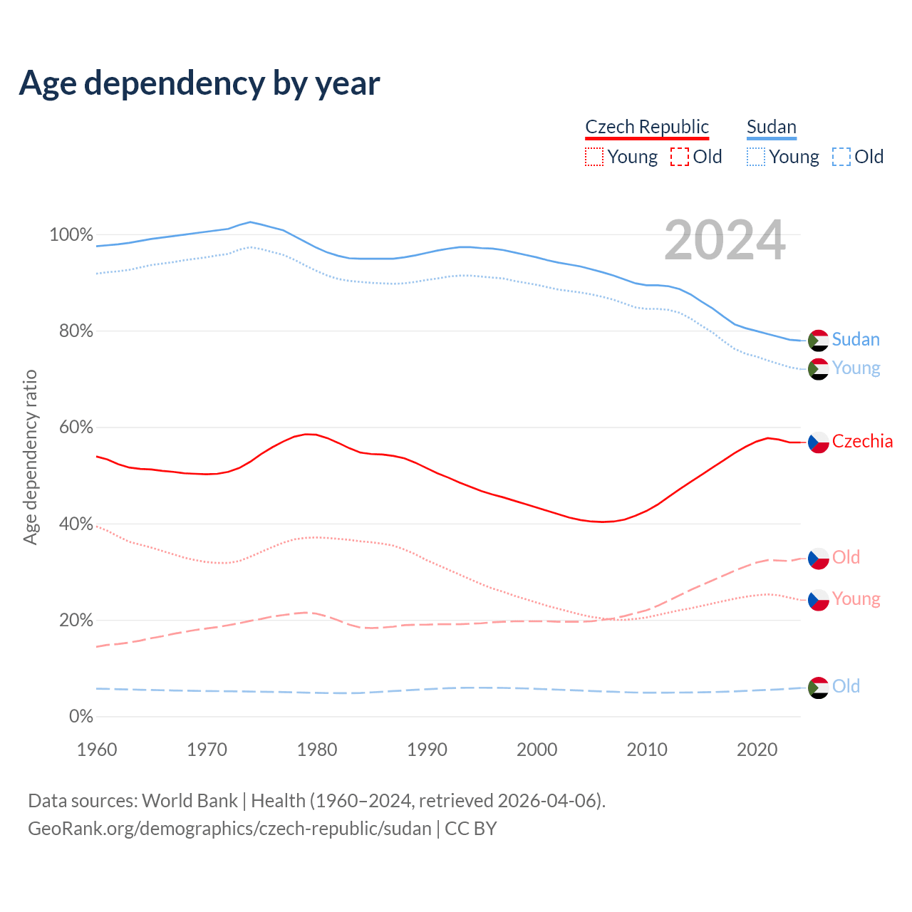 - The Czech Republic is ranked 21/196 by median age (oldest to youngest) vs 172/196 for Sudan.