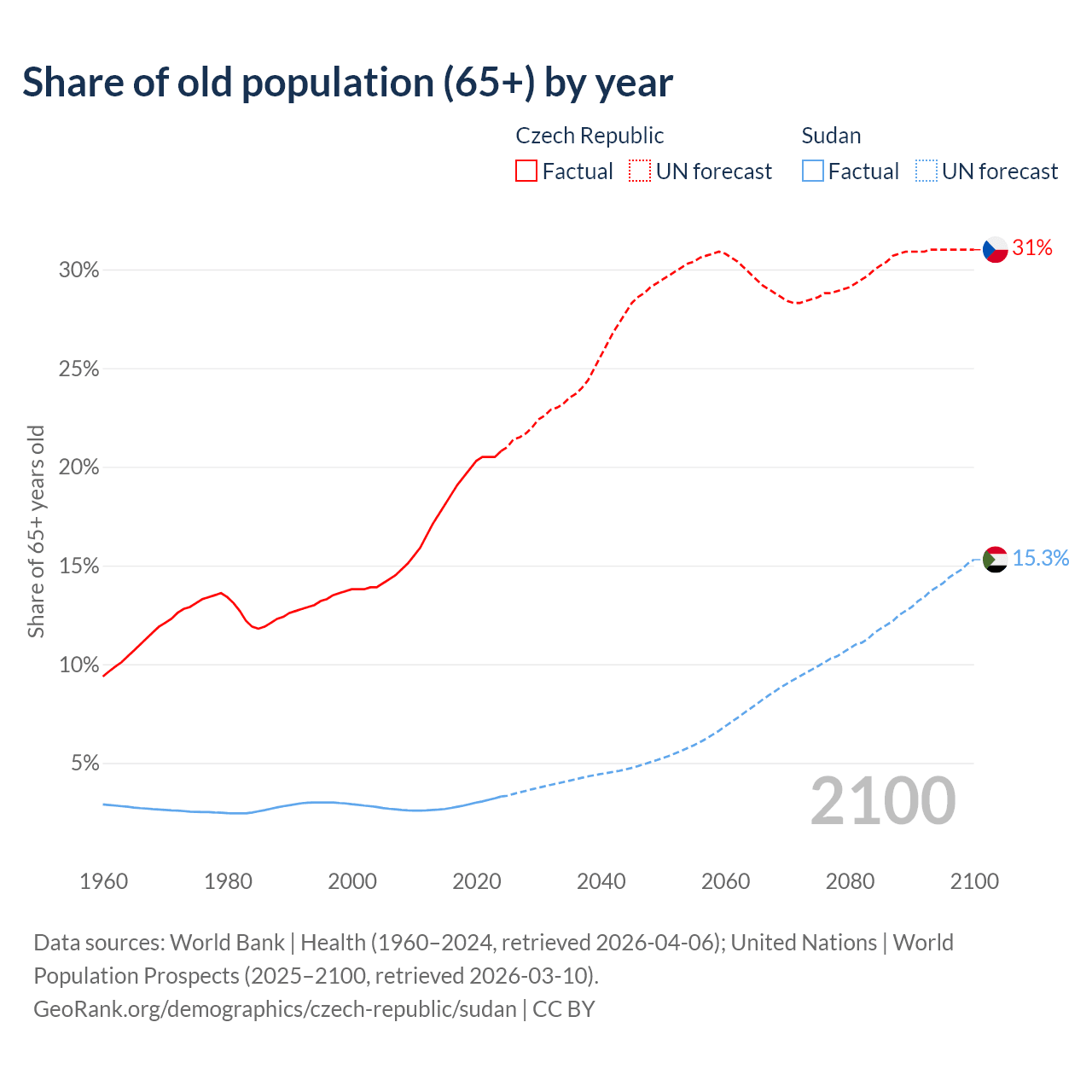 The share of older people aged 65 and over is 20.8% in the Czech Republic and 3.3% in Sudan. Life expectancy in the Czech Republic compared to Sudan .