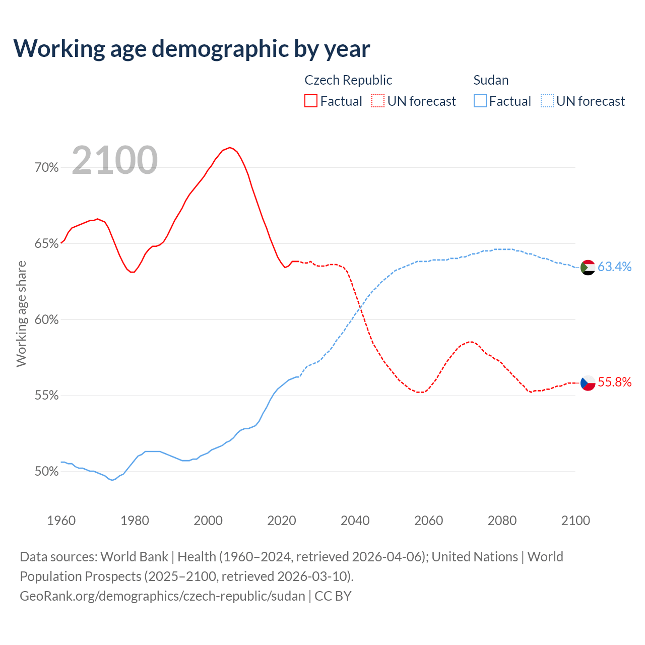 Median age Czech Republic vs Sudan, 1960-2100