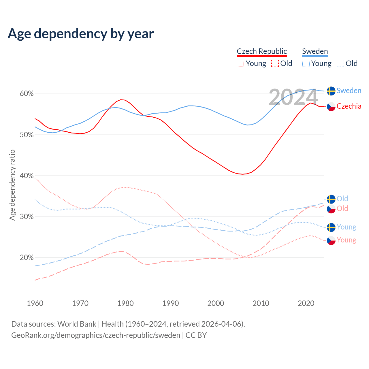 - The Czech Republic is ranked 21/196 by median age (oldest to youngest) vs 39/196 for Sweden.