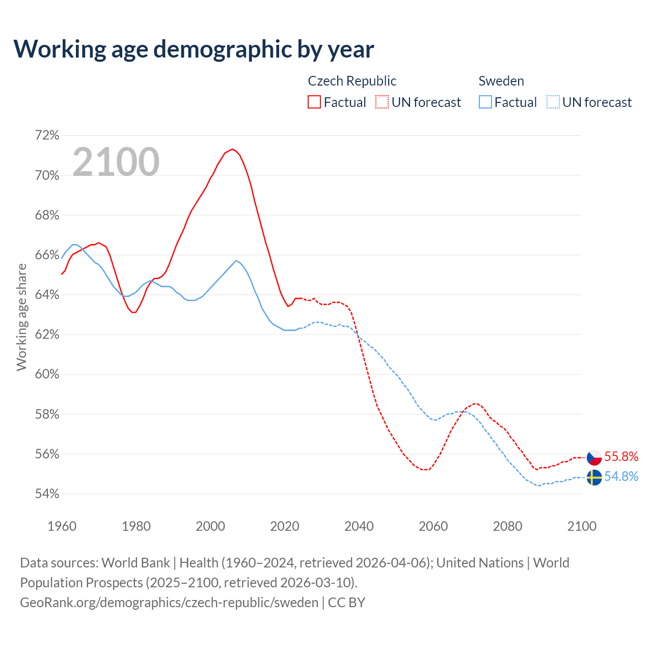 Median age Czech Republic vs Sweden, 1960-2100