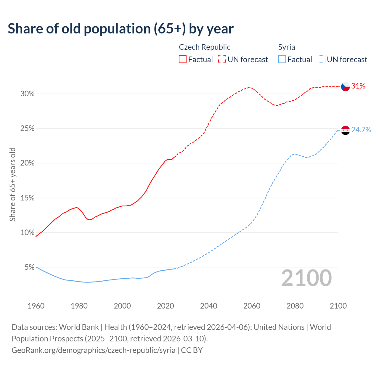 The share of older people aged 65 and over is 20.8% in the Czech Republic and 4.74% in Syria. Life expectancy in the Czech Republic compared to Syria .