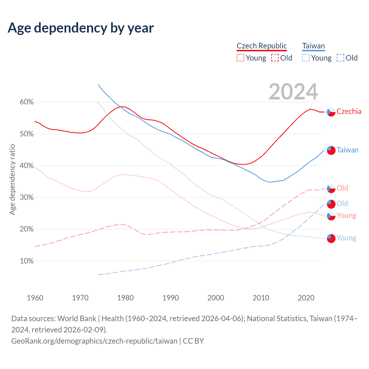 Data sources: World Bank | Health (1960–2024, retrieved 2026-04-06); U.S. Census Bureau (1960–2024, retrieved 2026-02-08); National Statistics, Taiwan (1974–2024, retrieved 2026-02-09).