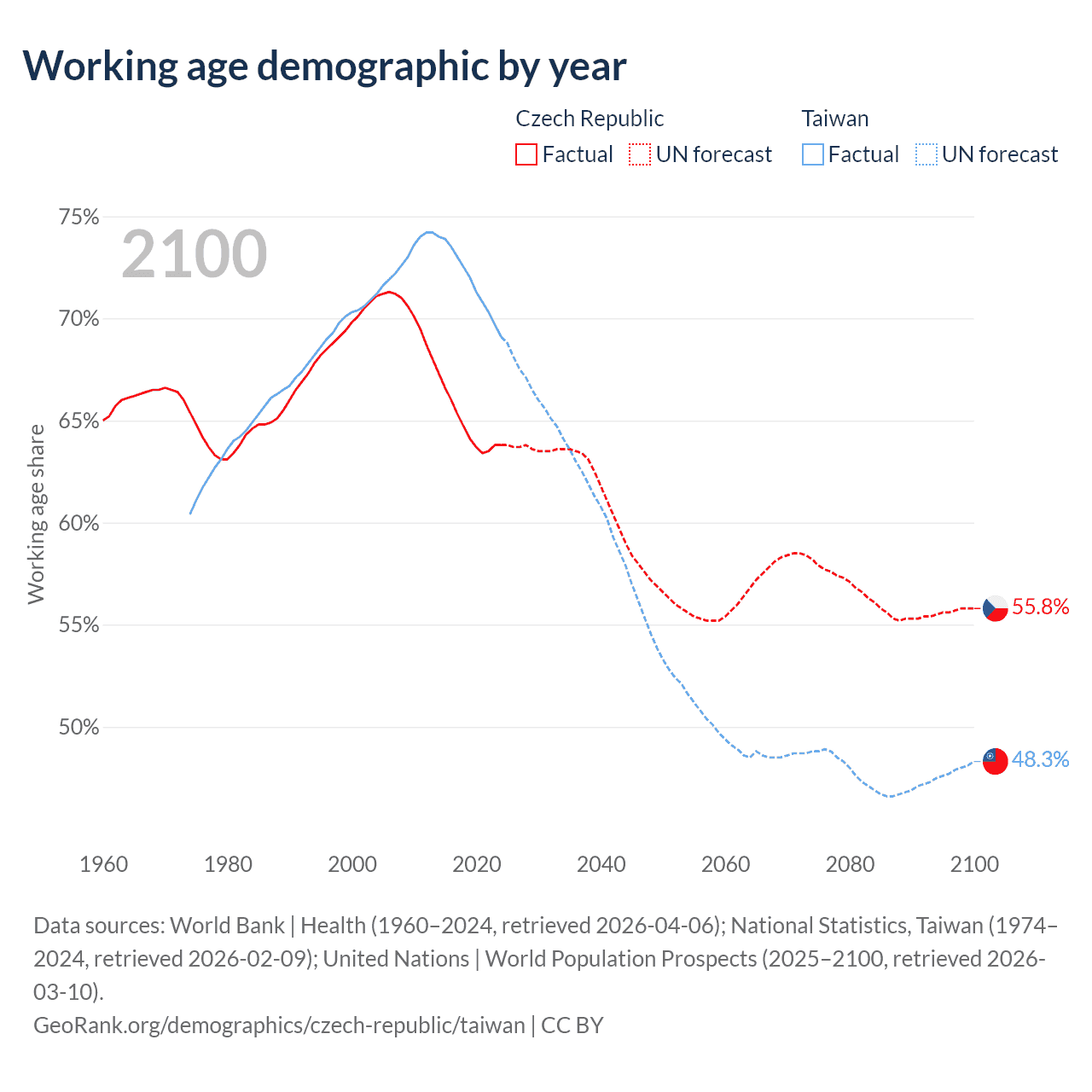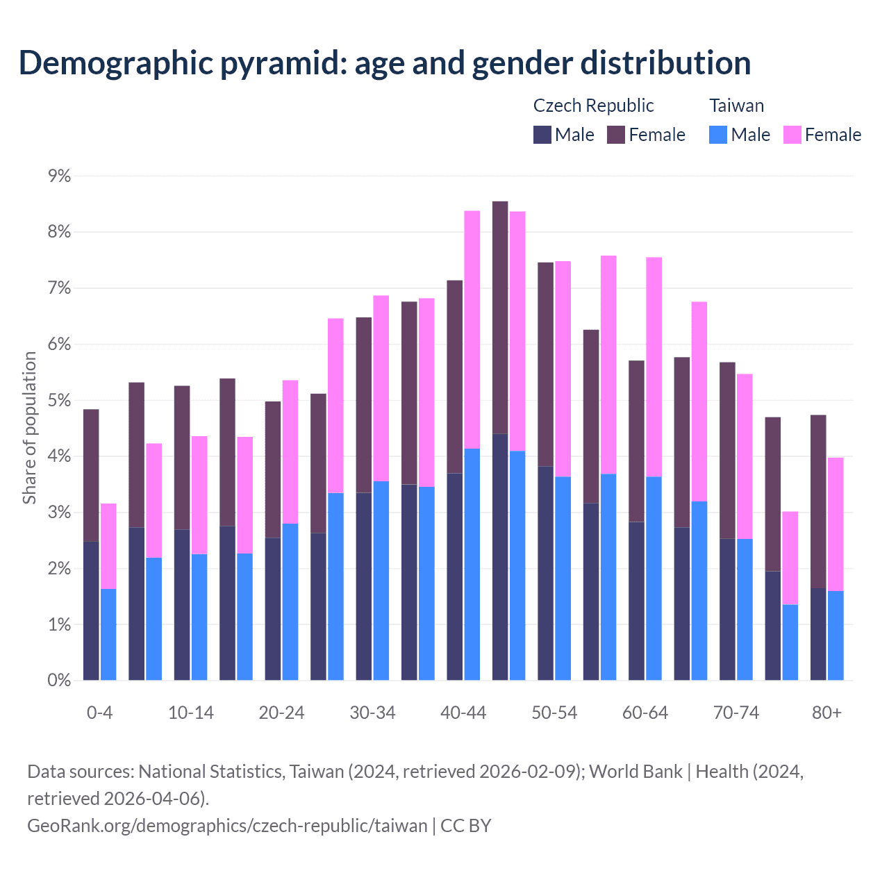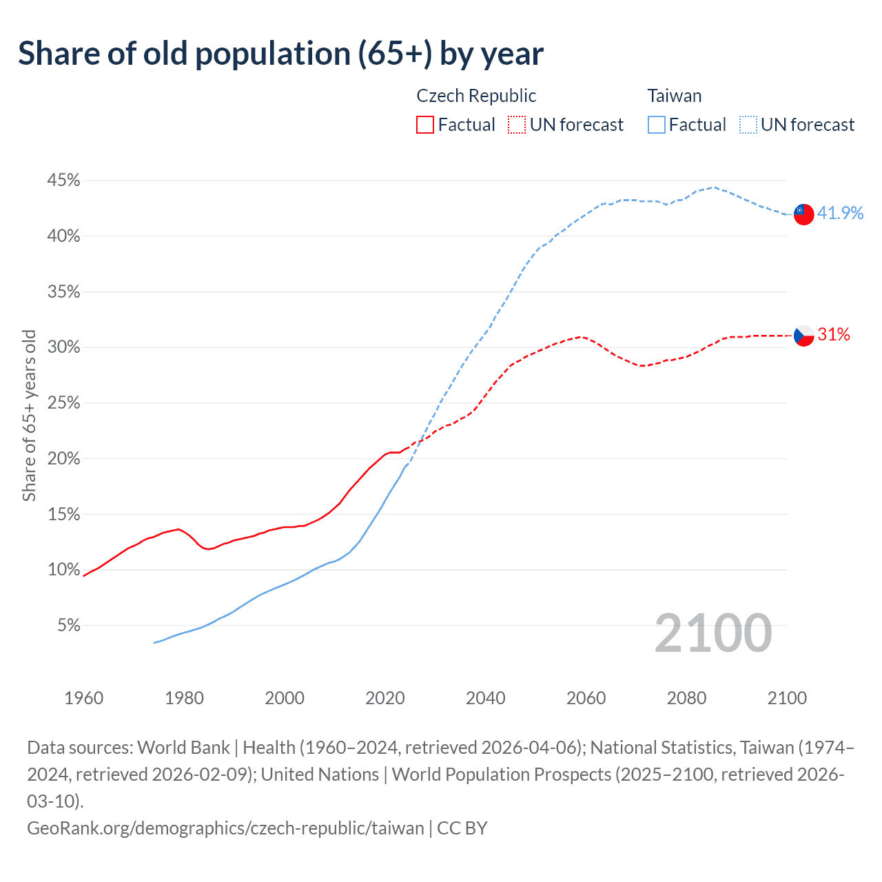 The share of older people aged 65 and over is 20.8% in the Czech Republic and 19.2% in Taiwan. Life expectancy in the Czech Republic compared to Taiwan .