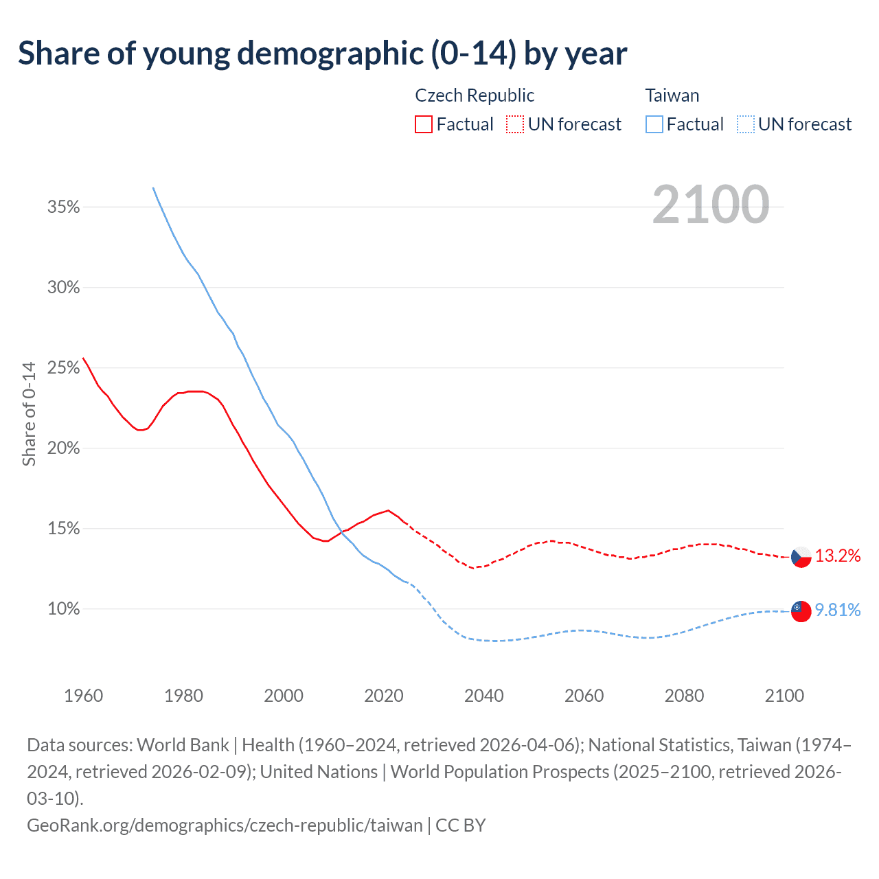 - The share of young demographic (0-15 years old) in the Czech Republic is 15.4% vs 11.7% in Taiwan.