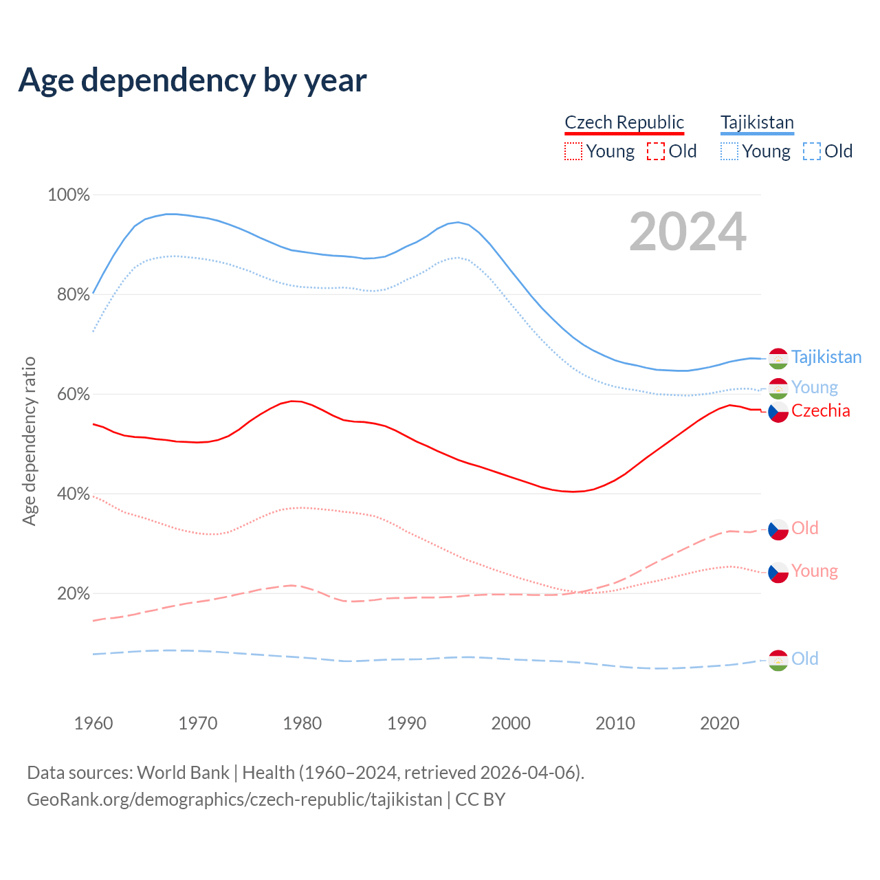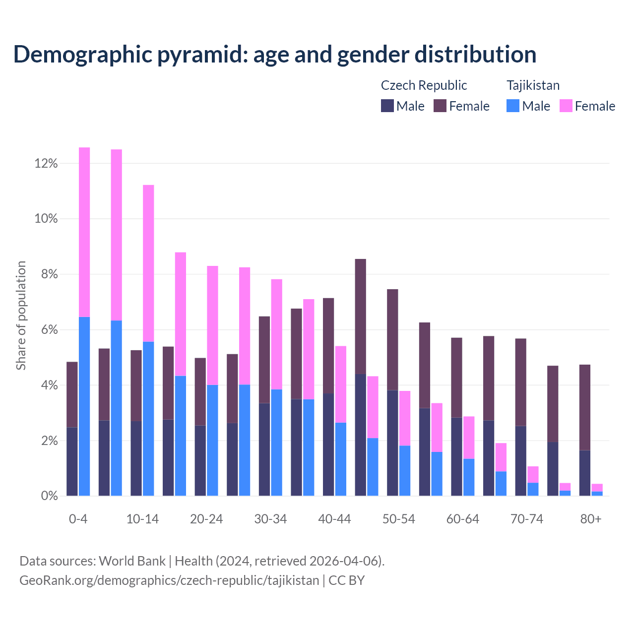 - The share of old-age demographic (65+) in the Czech Republic is 20.8% vs 3.85% in Tajikistan.