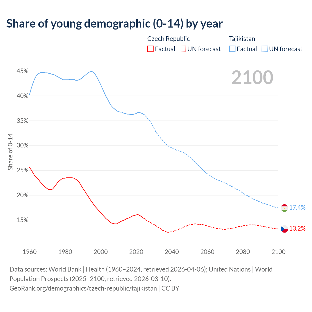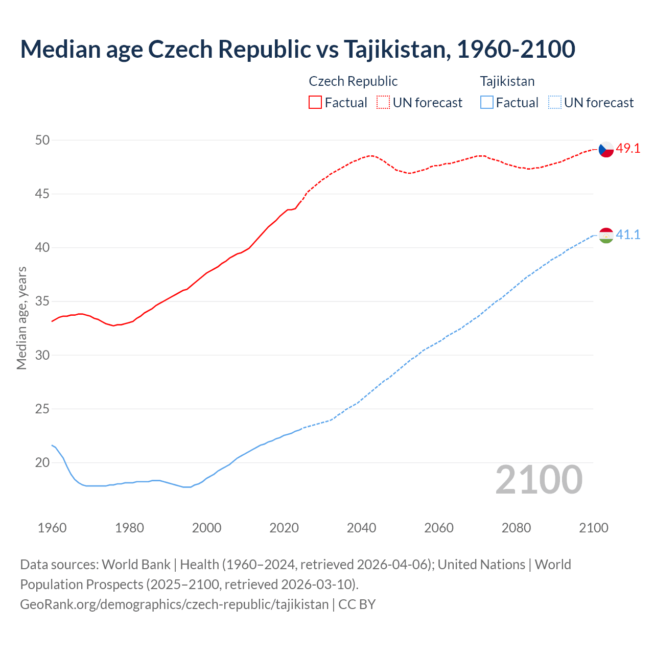 Median age Czech Republic vs Tajikistan, 1960-2100