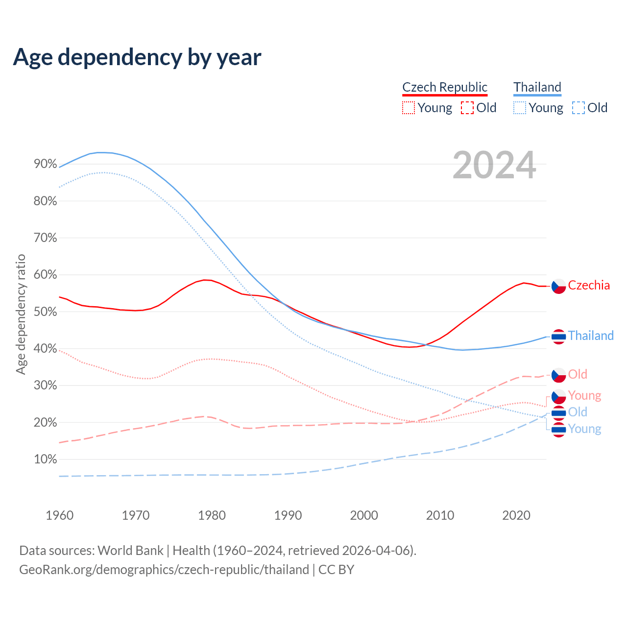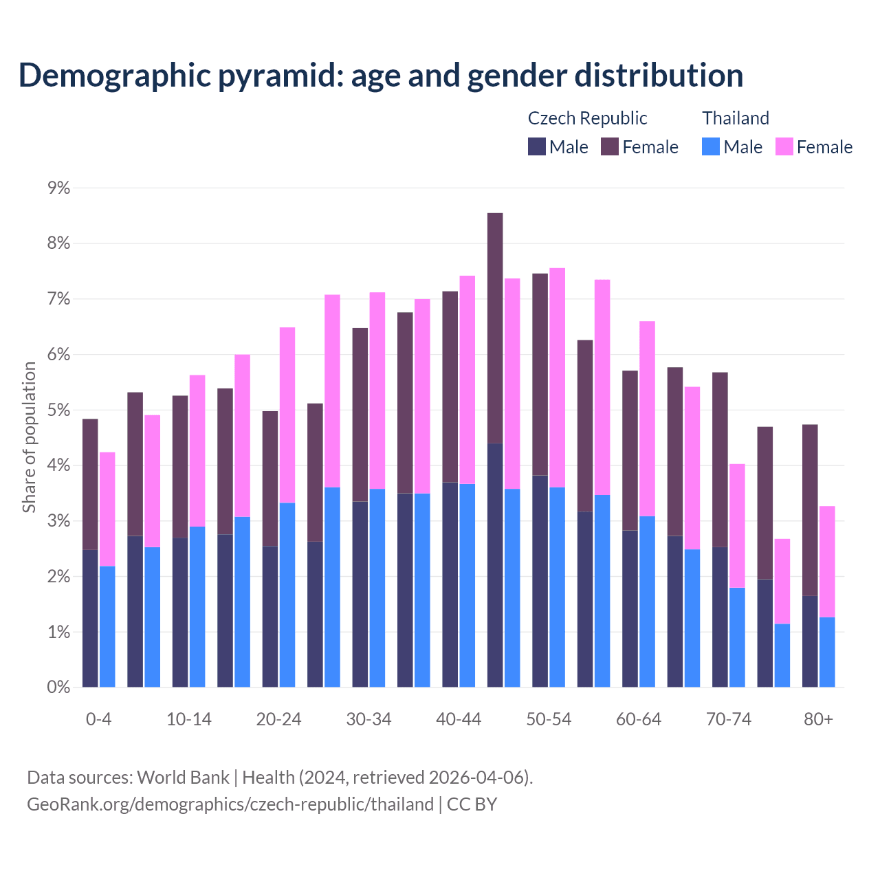 - The Czech Republic is ranked 21/196 by median age (oldest to youngest) vs 40/196 for Thailand.