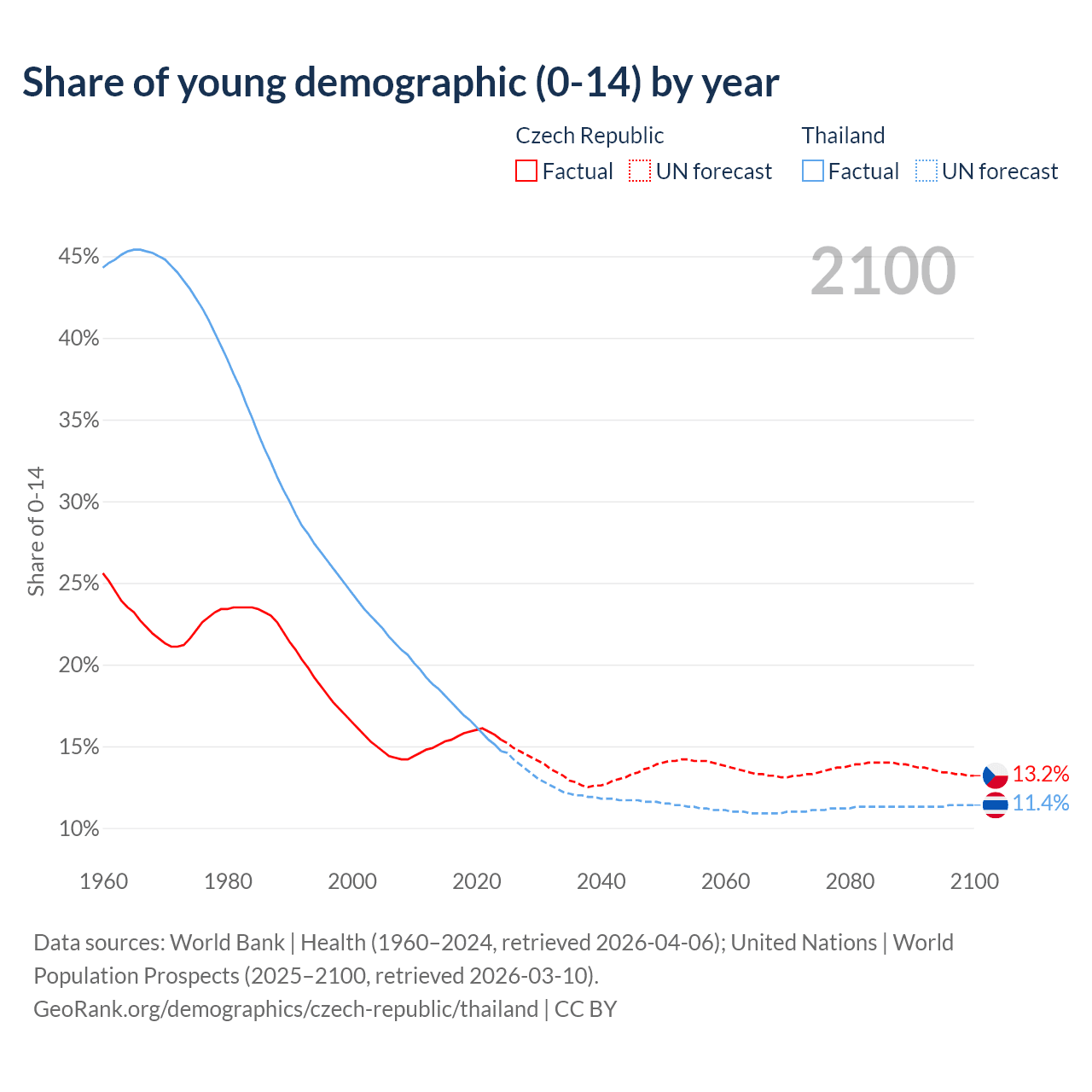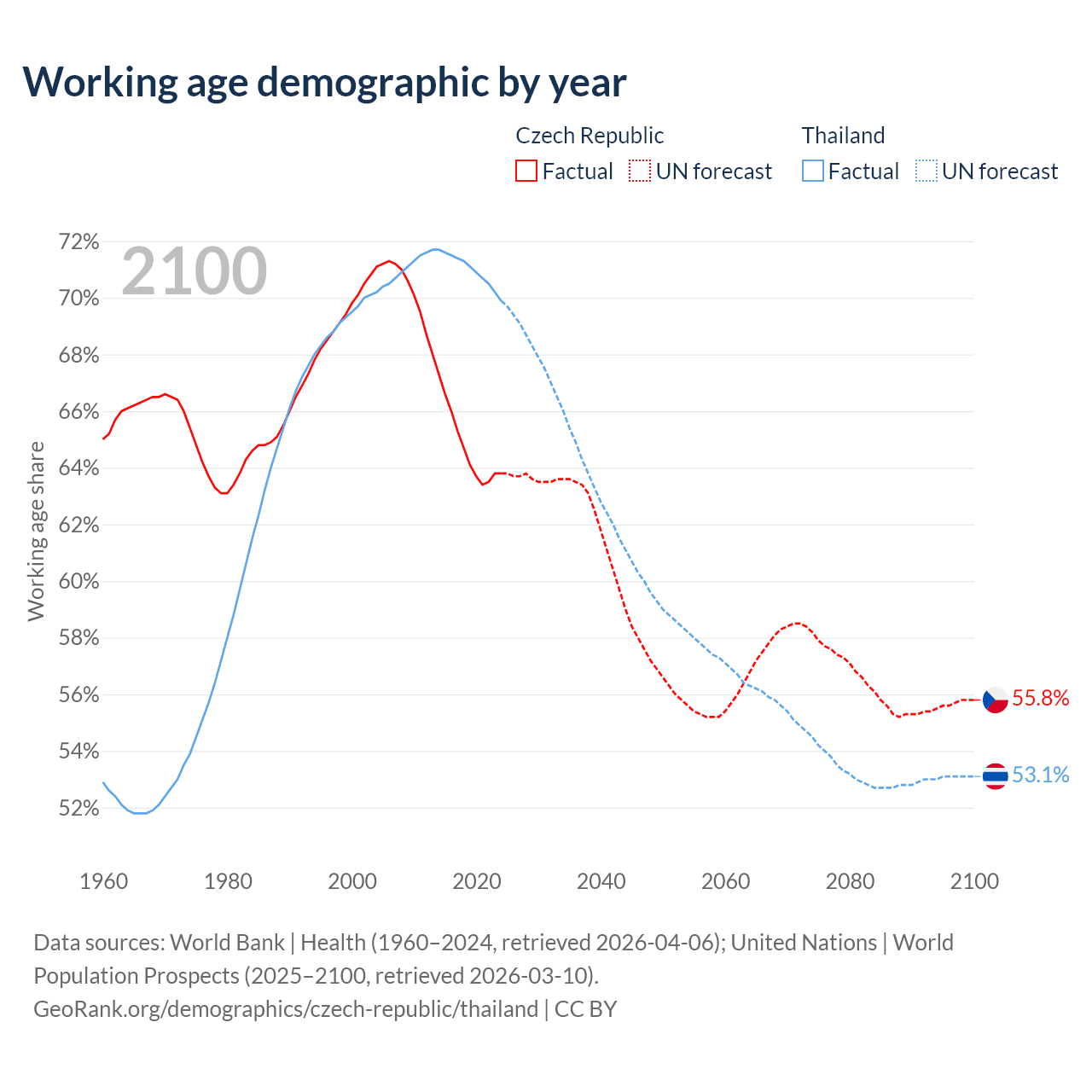Median age Czech Republic vs Thailand, 1960-2100