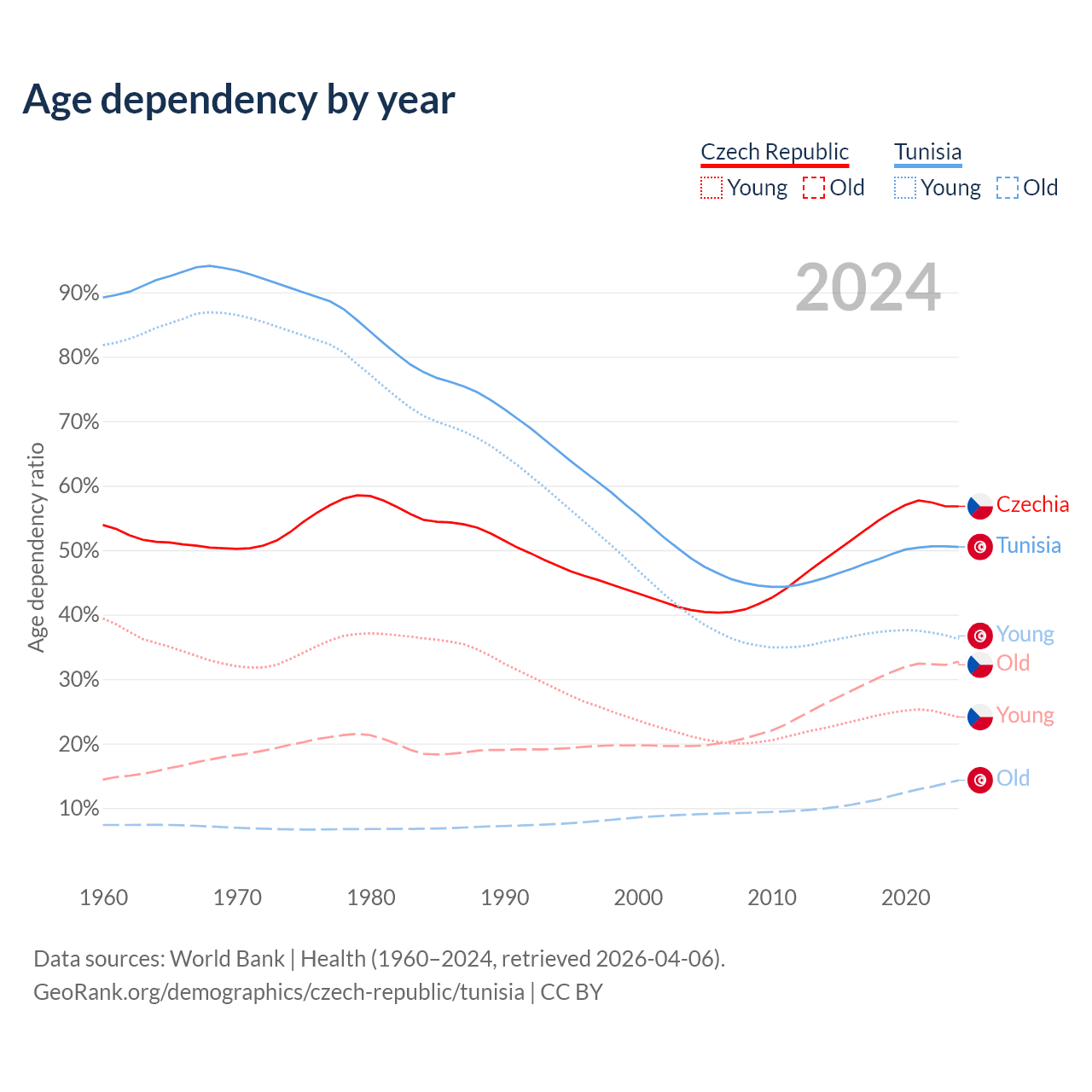 - The Czech Republic is ranked 21/196 by median age (oldest to youngest) vs 86/196 for Tunisia.