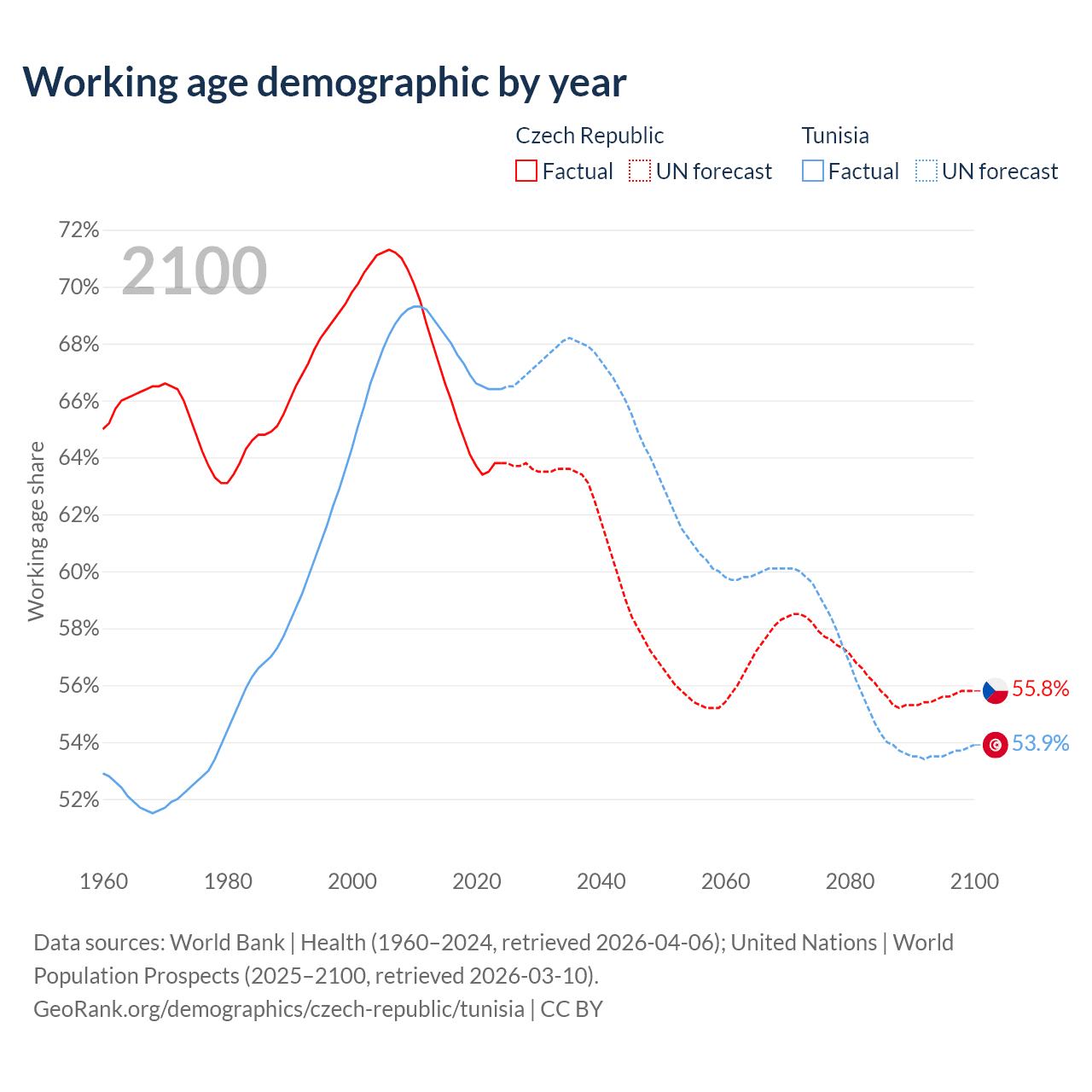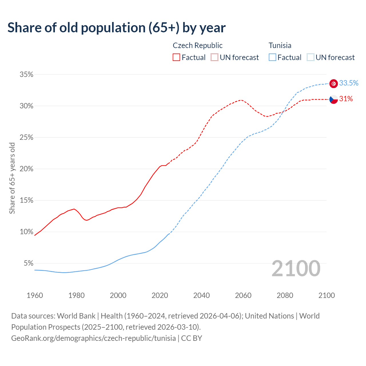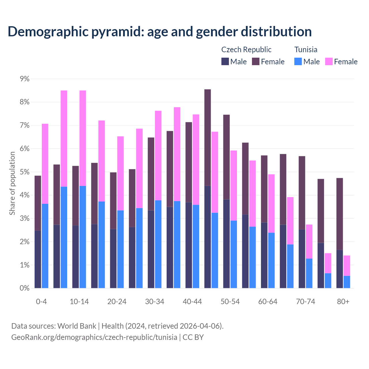 The share of older people aged 65 and over is 20.8% in the Czech Republic and 9.53% in Tunisia. Life expectancy in the Czech Republic compared to Tunisia .