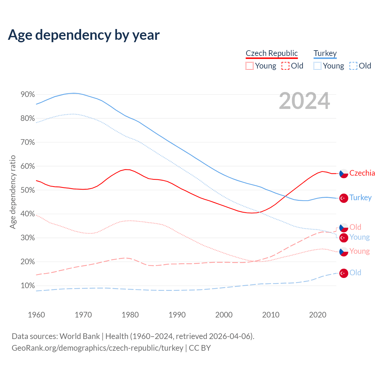 - The Czech Republic is ranked 21/196 by median age (oldest to youngest) vs 83/196 for Turkey.
