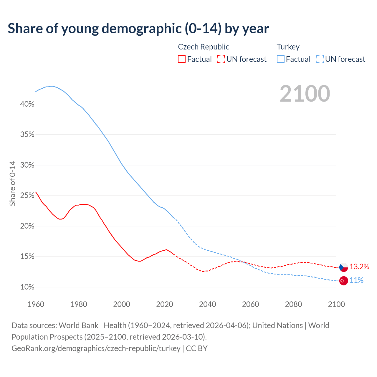 - The share of young demographic (0-15 years old) in the Czech Republic is 15.4% vs 21.4% in Turkey.
